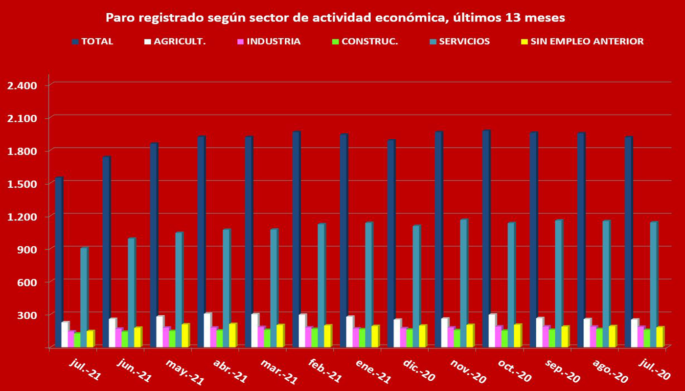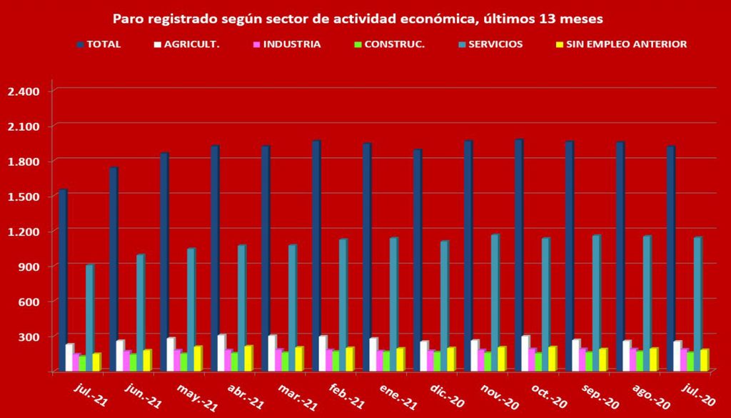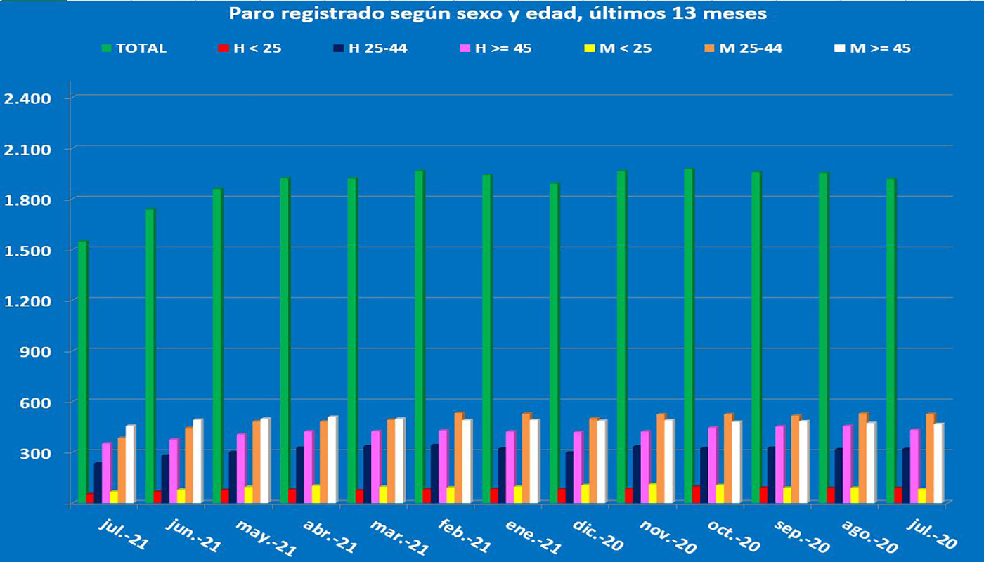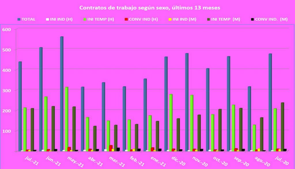 Destacar en esta ocasión el descenso en la cifra global de parados, pasan do de 1.736 a 1.547, lo que significa que 189 personas encontraron trabajo en el mes de julio, aunque el empleo sigue siendo de escasa calidad y con contratos bastante precarios. Baste decir que solo 17 de los 438 contratos firmados en dicho mes fueron indefinidos y, de ellos, solo fueron 3 hombres y 5 mujeres los que estamparon su firma para iniciar su relación laboral con un contrato indefinido. Del resto, 212 hombres y 209 mujeres firmaron otros tantos contratos con carácter temporal y, por tanto, con fecha de finalización.