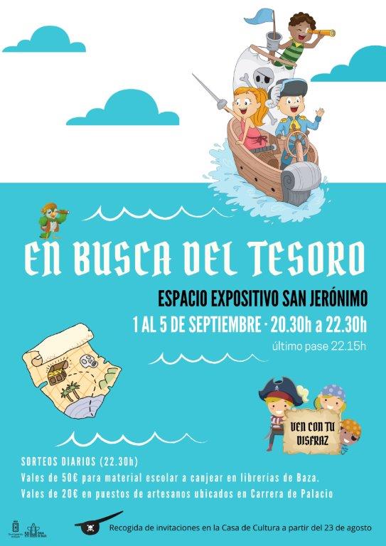 ‘Septiembre Alternativo’ arranca con “En busca del tesoro”, actividad programada del 1 al 5 de septiembre en el espacio expositivo de San Jerónimo en horario de 20.30h a 22.30h. Se trata de una propuesta para toda la familia al estilo de la exitosa “La fábrica de los juguetes” a la que se invita a acudir con disfraz. Las invitaciones se pueden recoger en la Casa de la Cultura. Habrá sorteos diarios de vales de 50 euros para material escolar a canjear en librerías de Baza y de vales de 20 euros a canjear en puestos de artesanos instalados en Carrera de Palacio.