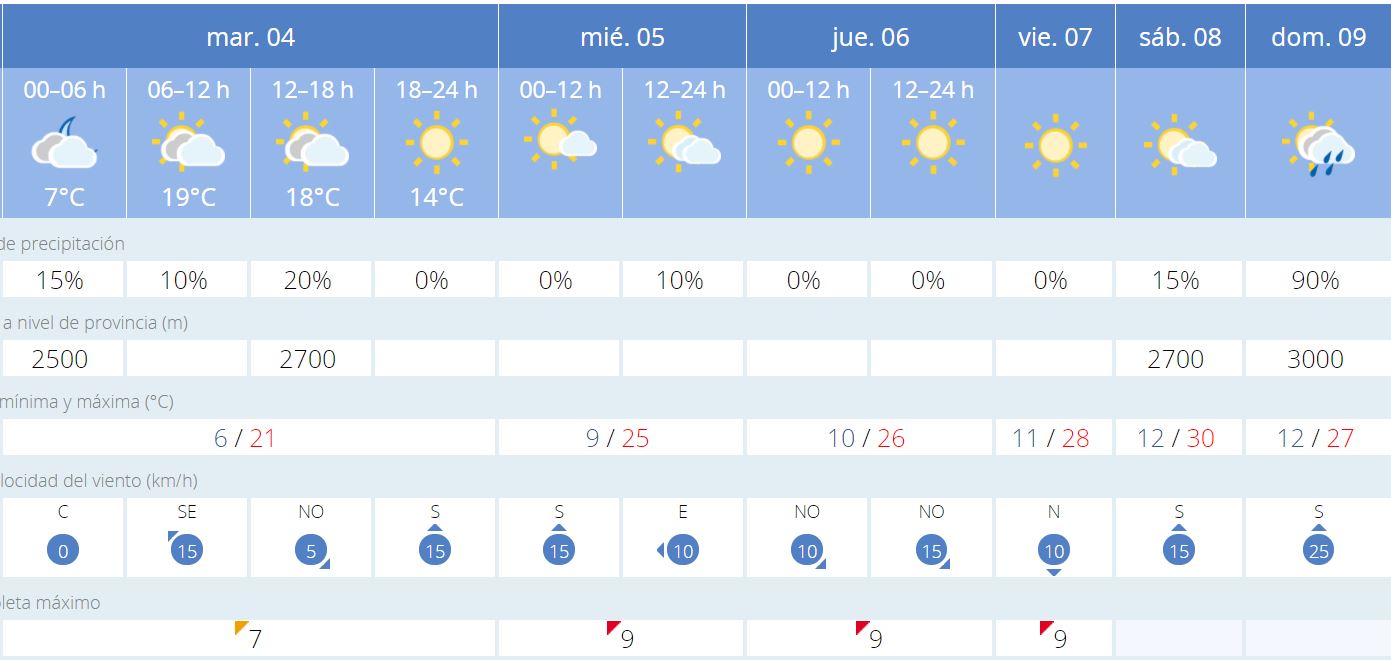 Destacar también, como dato muy importante, el aumento de los índices de rayos ultravioleta que tanto peligro pueden acarrear en las exposiciones solares. Esta semana se alcanzará ya el índice 9, lo que significa que nos acercamos a valores extremos que tienen su máximo en el nivel 11. Por tanto, no estaría de más empezar a coger el hábito de usar protección, sobre todo en el caso de tener que permanecer con exposiciones prolongadas a los rayos solares. Nuestra salud lo agradecerá.