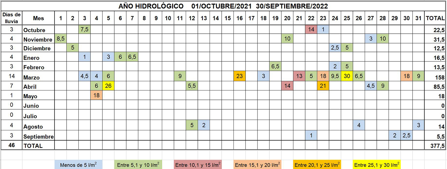Así llovió en Baza durante el año hidrológico 2021-22 (Clicar encima para ampliar)