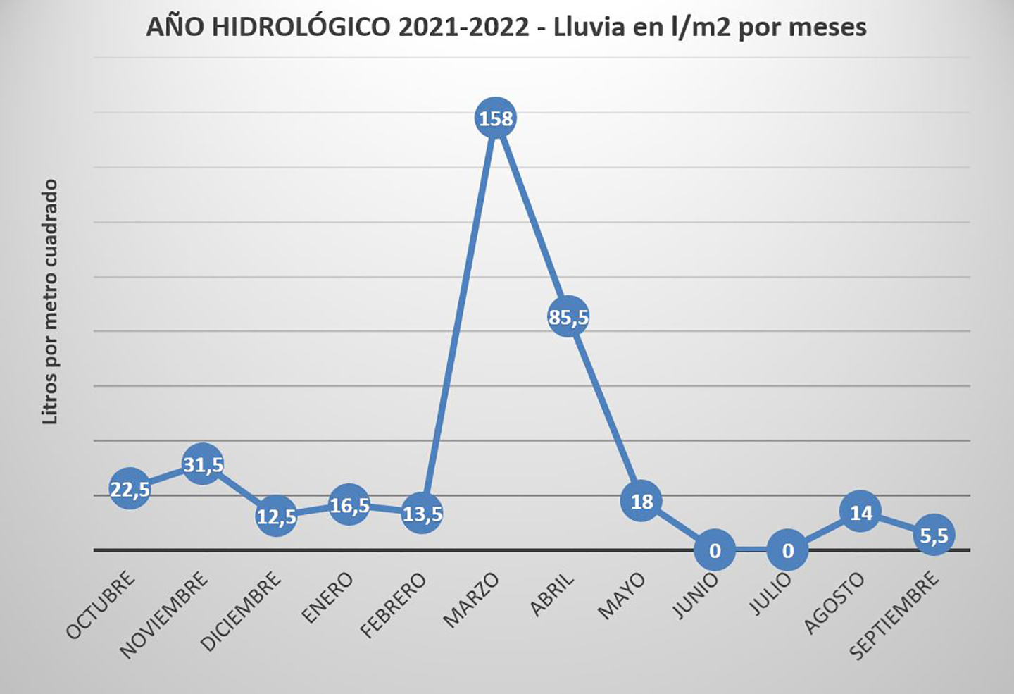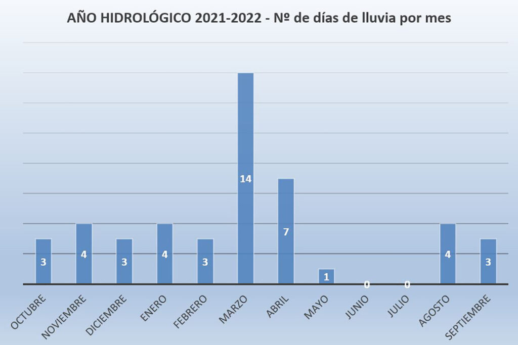 Destacar también el hecho de que, durante diez de los meses del último año hidrológico, los días de lluvia oscilaron entre 0 y 4, mientras que en el mes de abril tuvimos lluvia en 7 días y en el mes de marzo se llegó a los 14 días lluviosos.
