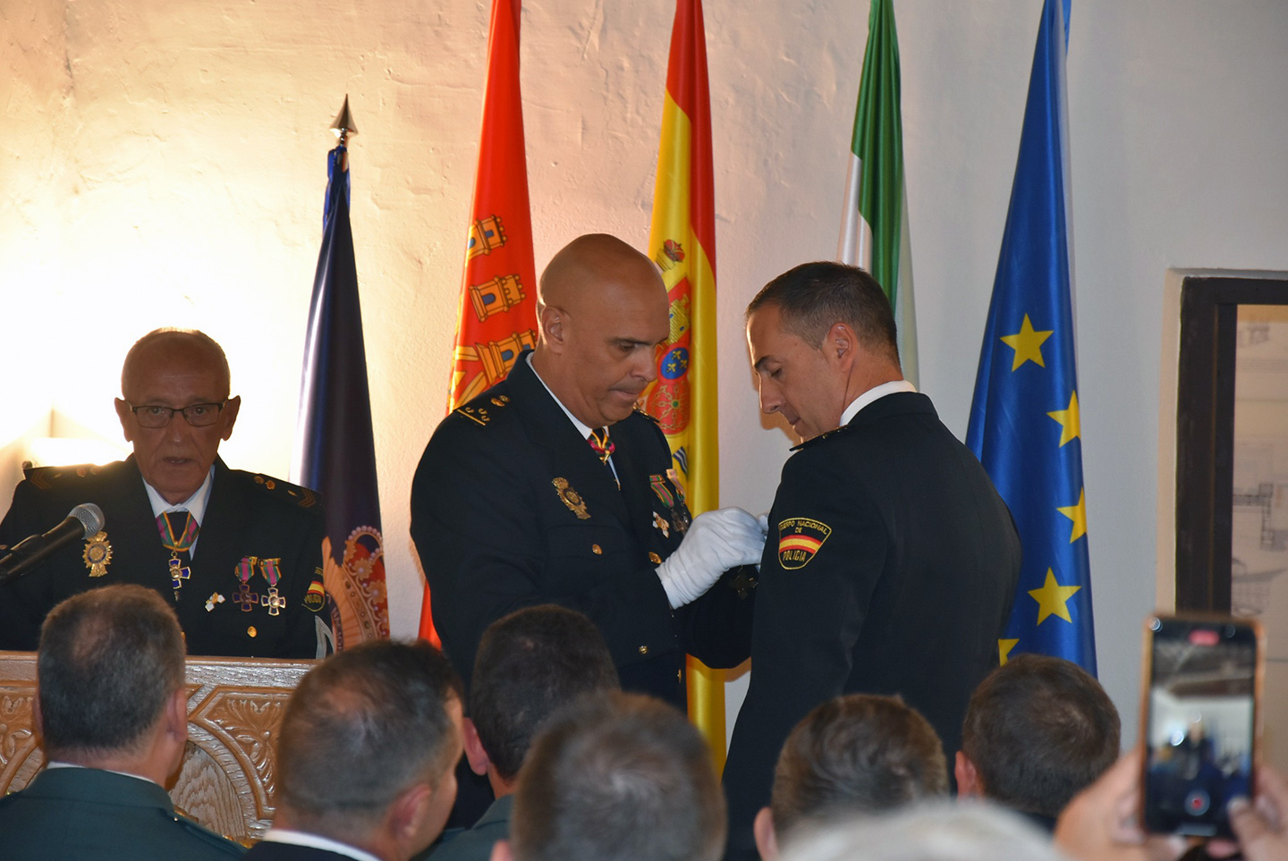 En el transcurso del acto, que arrancaba con el himno de España y finalizaba con un homenaje a los Policías fallecidos en acto de servicio y el Himno de la Policía Nacional, se hizo entrega de dos condecoraciones de ingreso a la Orden al Mérito Policial, a otros tantos agentes de Baza, y de un reconocimiento por méritos deportivos.