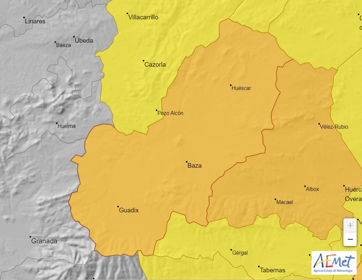 La Agencia Estatal de Meteorología amplía su alerta por nieve para hoy en Baza y otras comarcas de su entorno al pasarla de nivel amarillo a naranja. A medida que se ha ido acercando la jornada de hoy martes, han ido aumentando también los riesgos derivados de la previsión de nieve en las comarcas de Baza, Huéscar y Guadix , en la provincia de Granada, y otras como el Valle del Almanzora o Los Vélez en la provincia almeriense.