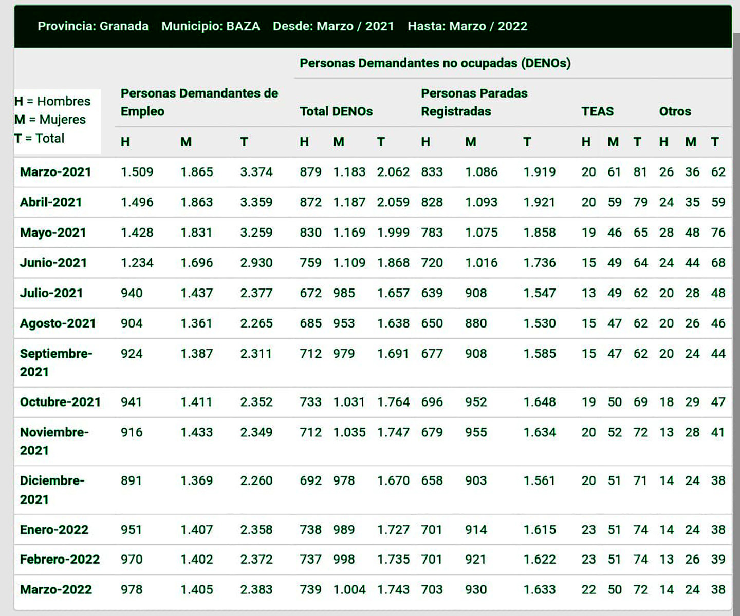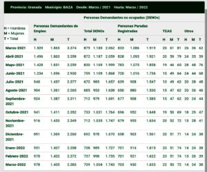 En cuanto a la cifra de desempleados en Baza, se pasó de los 1.622 del pasado febrero a los 1.633 de marzo, con 11 desempleados más, pero mejorando la tasa interanual ya que en marzo de 2021 fueron 1.919 los parados contabilizados, con respecto a los que el descenso ha sido de 286 personas. De estos parados, 703 son hombres y 930 mujeres, mientras que las personas que están inscritas como demandantes de empleo son 2.383, de los que 978 son hombres y 1.405 mujeres.