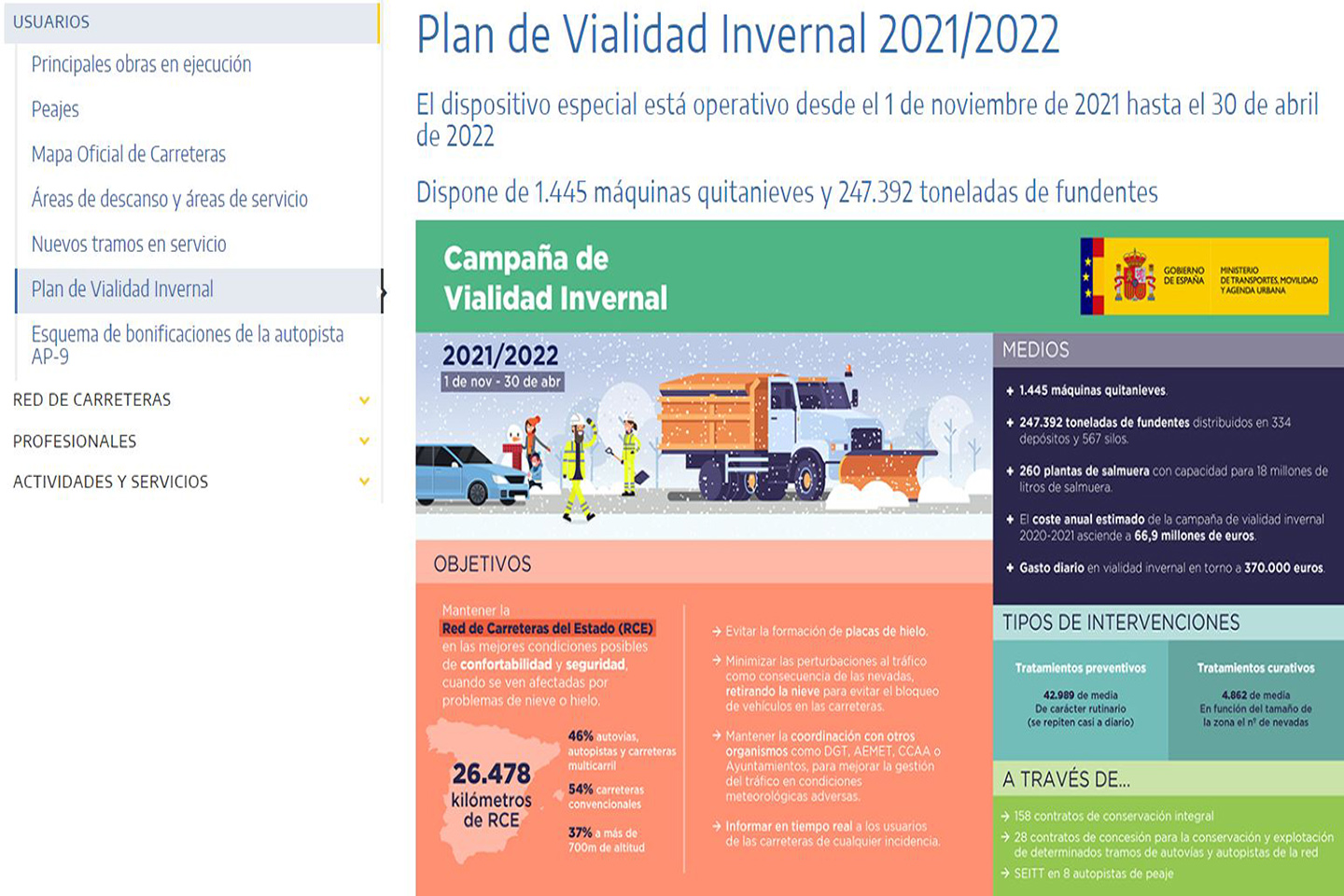 El Plan de Vialidad Invernal de Mitma, al que se puede acceder a través del anterior enlace, persigue mantener las carreteras de la Red de Carreteras del Estado, en época invernal, cuando se ven afectadas por problemas de nieve o hielo, en las mejores condiciones posibles de confortabilidad y seguridad.