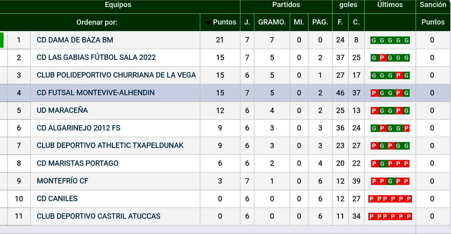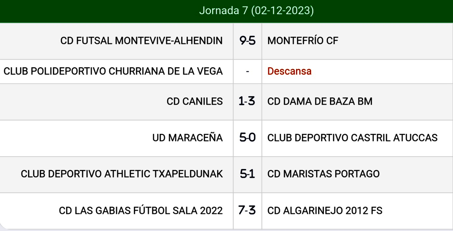 Terminada la jornada, y dado que el Churriana de la Vega descansó, el equipo damero se encuentra en lo alto de la tabla clasificatoria habiendo ganado los 7 partidos disputados, con 21 puntos, veinticuatro goles a favor, y solamente 8 en contra. Les sigue en la clasificación el C.D. Las Gabias Futsal 2022, Club Polideportivo Churriana de la Vega y Club Deportivo Futsal Montevive-Alhendín, todos con 15 puntos, teniendo el Churriana un partido menos.