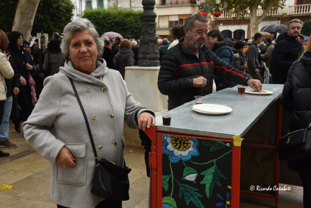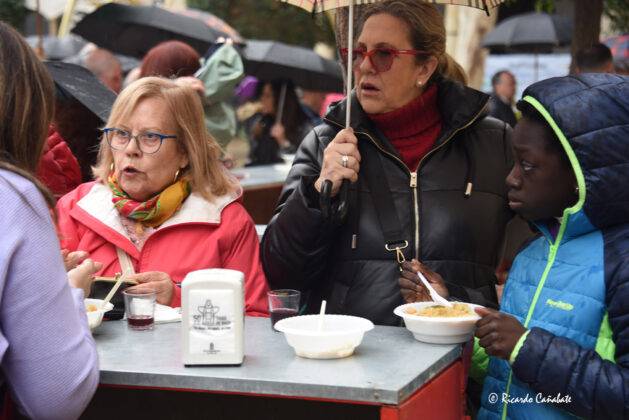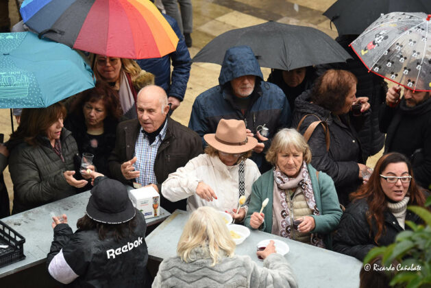 Llegó la lluvia, pero poco alteró una cata ya comenzada, en la que algunos de los asistentes supieron encontrar buenos refugios, en unos soportales abarrotados, bajo los árboles o abriendo un buen número de paraguas que permitían continuar con la degustación.