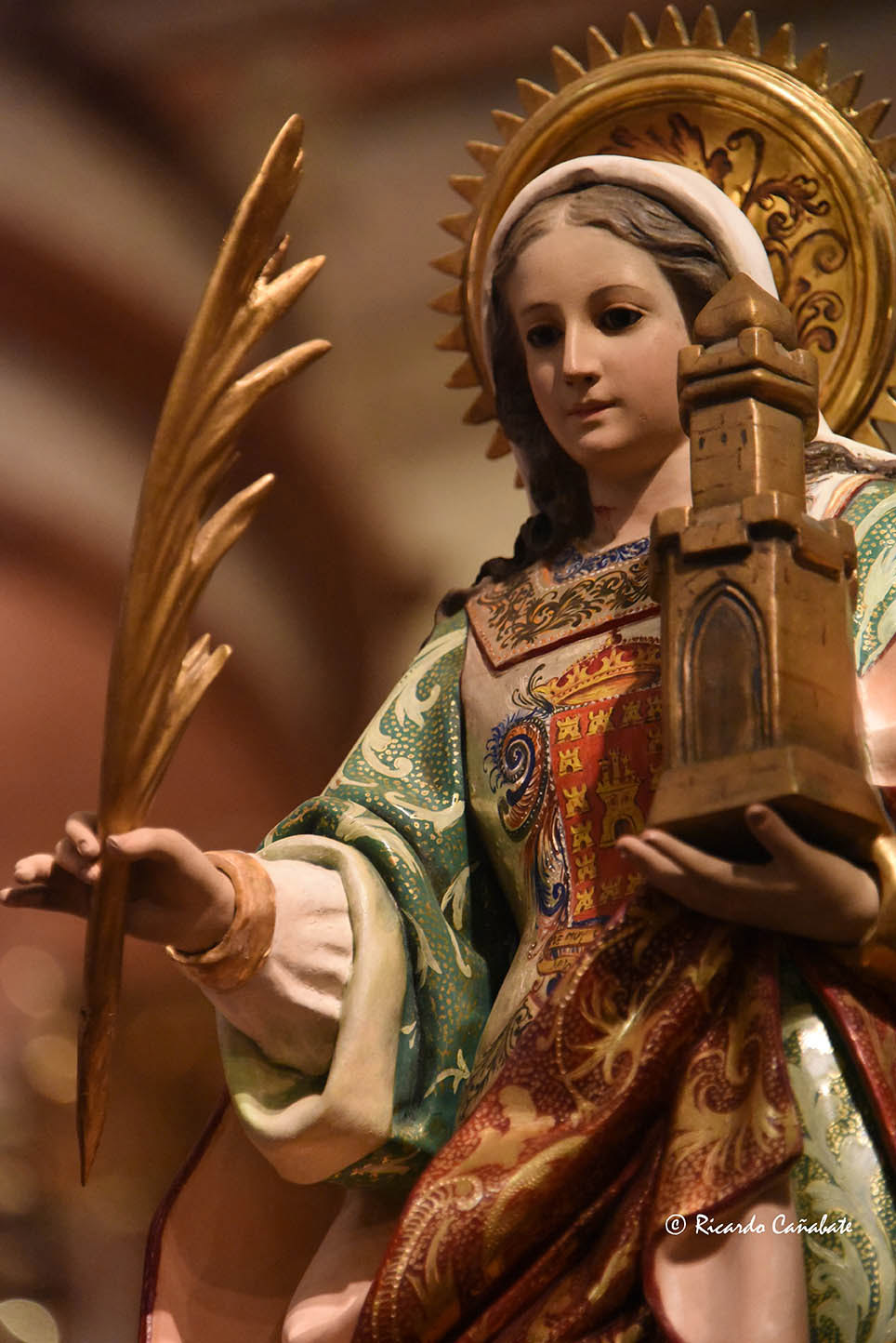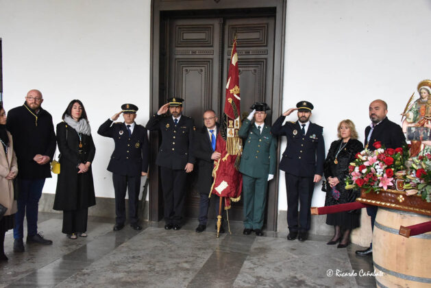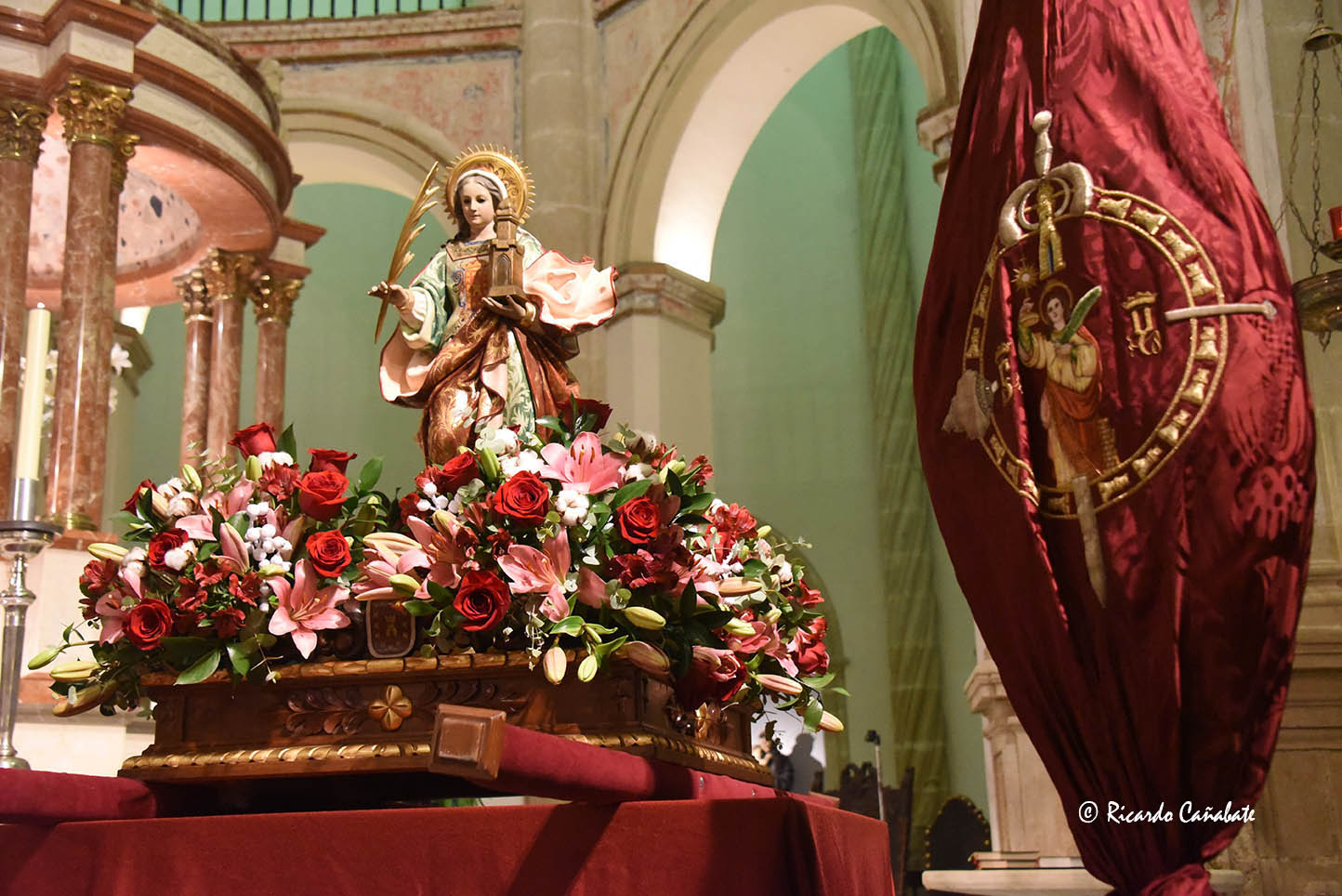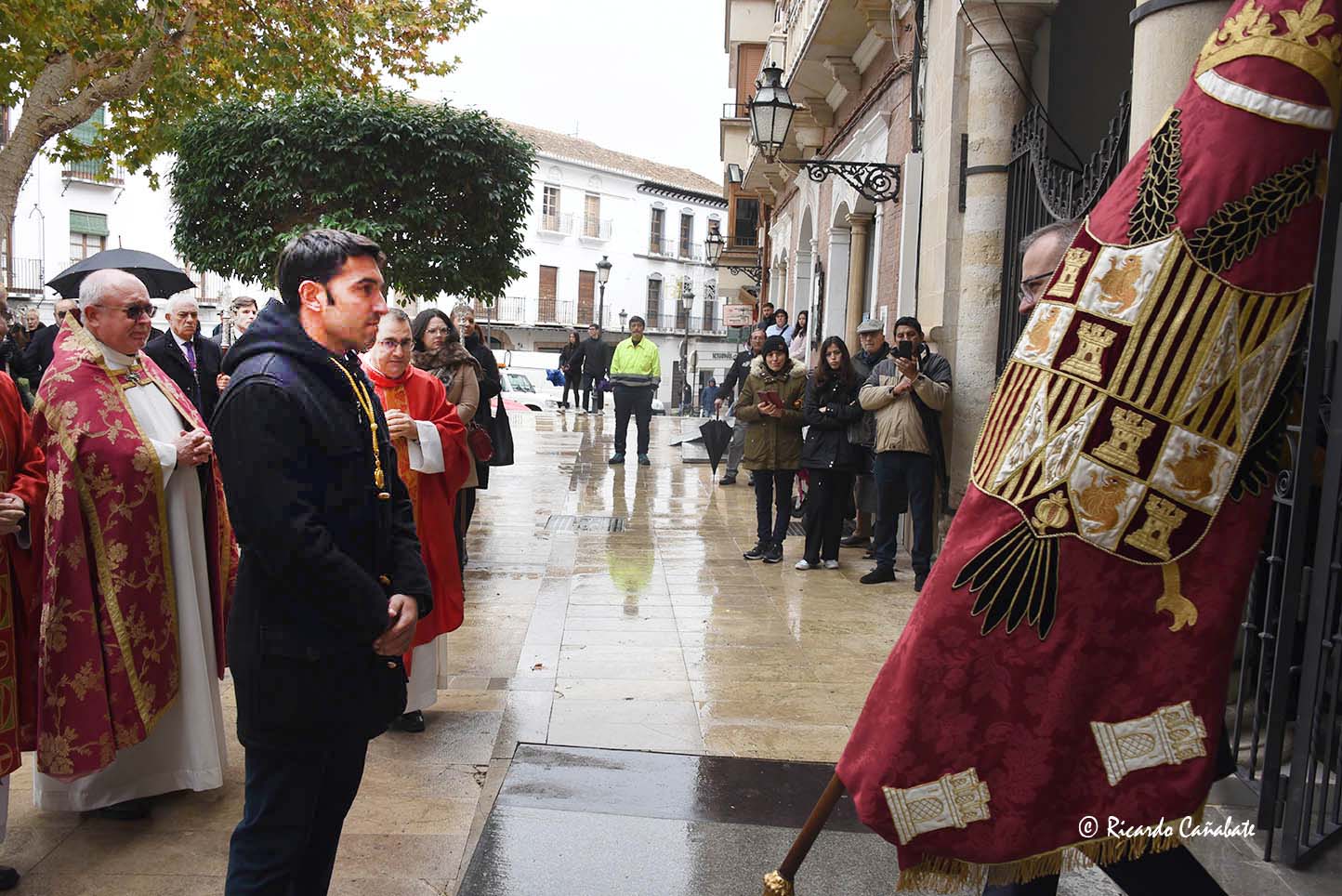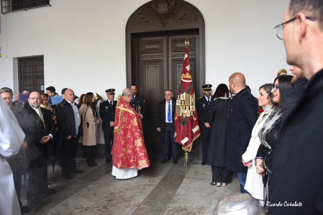 El acto se iniciaba con la entrega del Pendón Real que hizo el alcalde al edil más joven, para incorporarse todos ellos a la comitiva que emprendía camino de retorno a la Iglesia Mayor, ahora acompañada también de la patrona de la ciudad, Santa Bárbara, sobre sus pequeñas y bellamente adornadas andas, portadas por cuatro de los concejales.