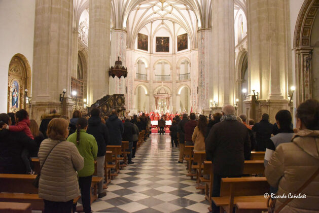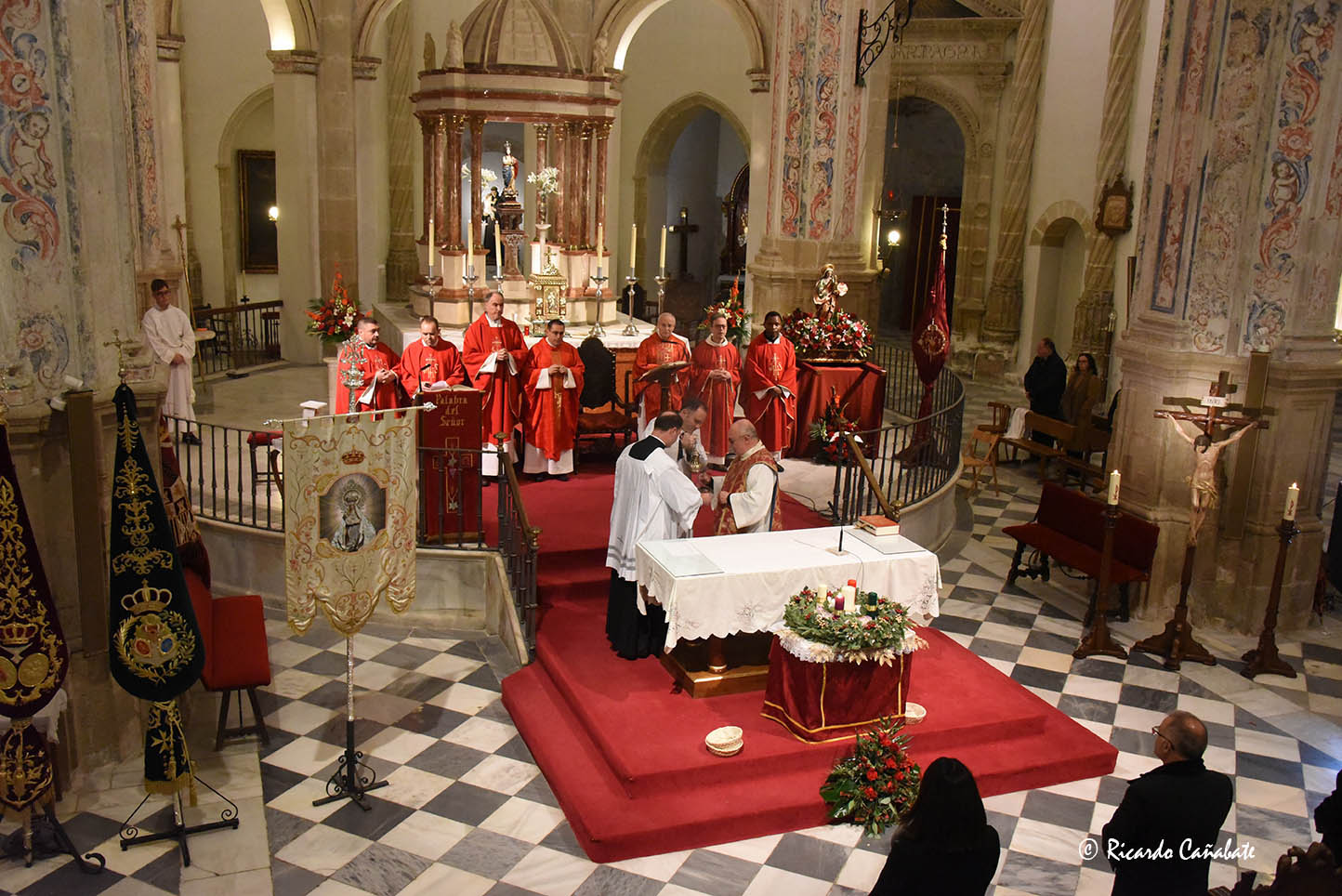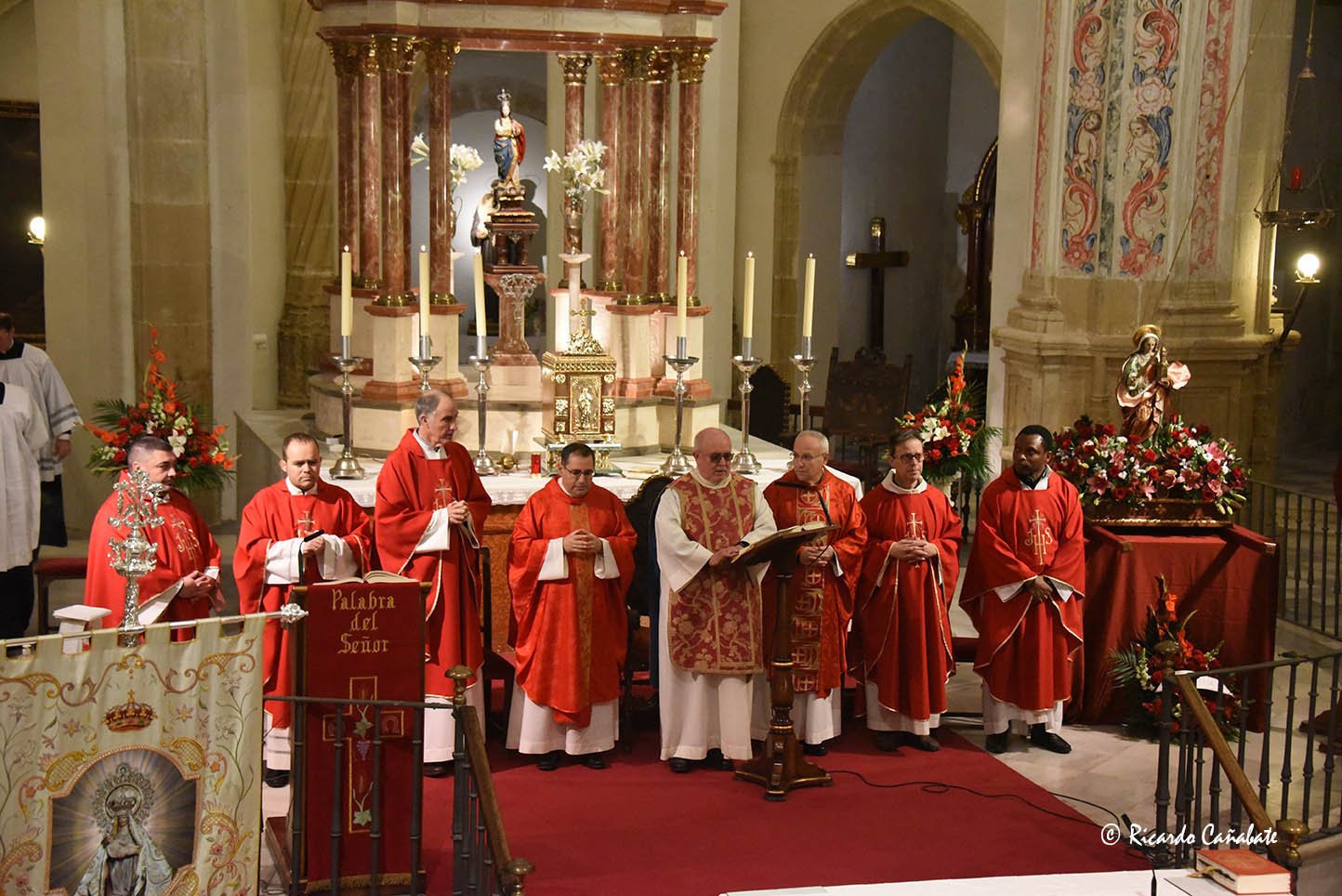 La Iglesia Mayor presentaba el aspecto de las grandes ocasiones, con todos sus asientos ocupados de quienes se disponían a asistir a la solemne ceremonia de la Eucaristía presidida por el Rvdo. Manuel Millán y concelebrada con siete sacerdotes de Baza y localidades vecinas, además del párroco de Santiago y su auxiliar en la parroquia. Ocupando lugar preferente en el altar, la patrona de Baza, a cuyos pies lucía un bonito obsequio floral ofrecido por la Hermandad de la Virgen de la Piedad, también patrona de Baza, desde época reciente.