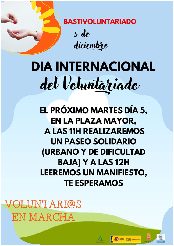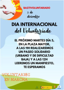Para celebrar esta jornada por todo lo alto, por segundo año se desarrolla en nuestra ciudad una nueva edición de “Bastivoluntariado” una jornada para homenajear y para compartir, para conocernos, para charlar, para organizar, para mejorar el servicio que ofrecen los voluntarios de tantas y tantas entidades. Para ello se ha convocado una concentración ese mismo día, el 5 de diciembre, en la Plaza Mayor. A las 11:00 horas se realizará un paseo solidario (urbano y de dificultad baja) y a las 12:00 se leerá un manifiesto: “Voluntarios en marcha”.