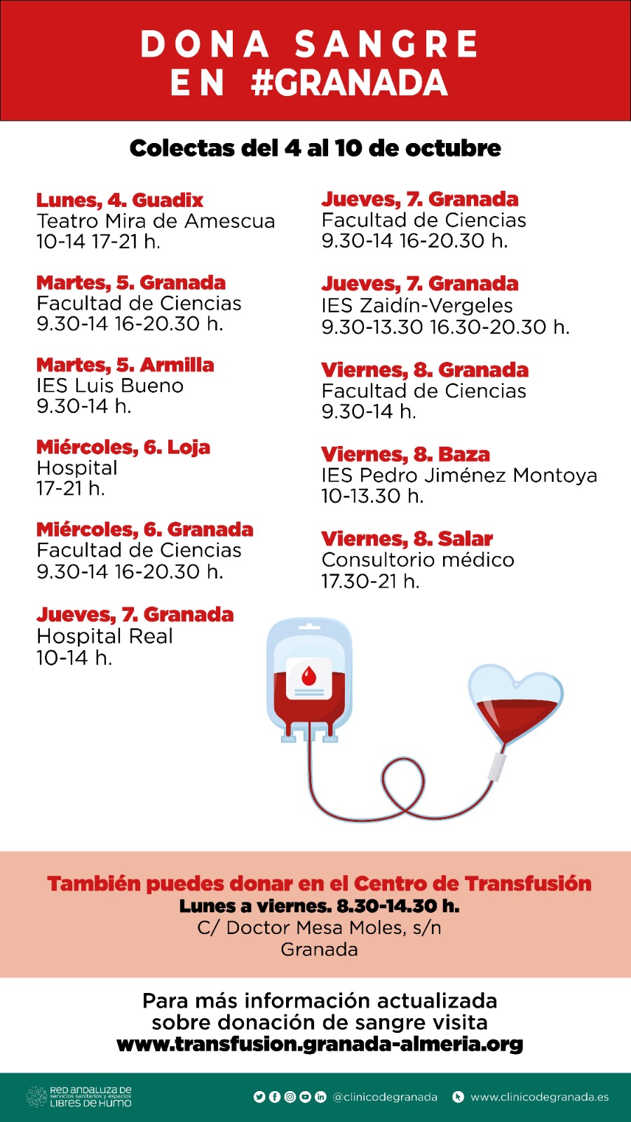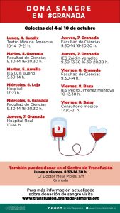 Así, a partir del lunes 4 de octubre y hasta el próximo domingo 10 de octubre, estarán habilitados hasta 11 puntos de donación por toda la provincia. En concreto en la capital se podrá acudir a la Facultad de Ciencias los días 5, 6, 7 y 8 de octubre. Además, el mismo día siete también estarán habilitados otros puntos como el Hospital Real, de 10:00 a 14:00 horas y el IES Zaidín-Vergeles.
