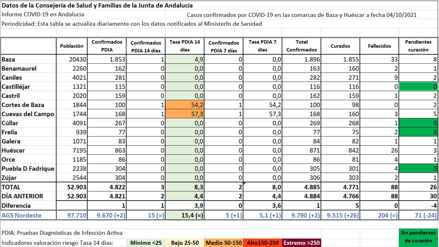 A esa circunstancia se une la de que Baza pasa a tener tasa cero a siete días, a la par que suma otros tres curados, a los que se unen uno más en Castilléjar y otro en Cuevas del Campo, con la buena nueva de que Castilléjar pasa a tener curada a toda su población, como ya hicieran Cúllar, Freila y La Puebla de don Fadrique, mientras que en el resto de municipios quedan pendientes de esa curación 26 pacientes, destacando los 8 de Baza y los 5 de Cuevas del Campo.