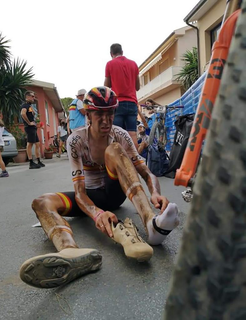 David Valero volvió a hacer tiempo de podio en el Campeonato del Mundo de Maratón, pero el tiempo dedicado a reparar su avería también contaba. Cuando llegó a la meta, exhausto y con las fuerzas vaciadas a lo largo del circuito, no pudo más que sentarse en el suelo, junto a su bicicleta, y ofrecer esa imagen que tanto dice de lo que había sido la carrera de todo un campeón, sin recompensa esta vez, pero seguro que contento de haber hecho lo que hizo como el gran deportista que sin duda es. Y si alguien lo duda, por favor, que vuelva a mirar esa foto.