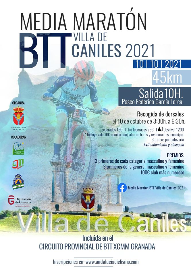 El 7 de octubre será el último día para inscribirse en la Media Maratón BTT Villa de Caniles, que tendrá un espectacular trazado de unos 45 kilómetros. El Circuito Provincial de Granada BTT Media Maratón 2021 celebrará su próxima prueba en la localidad de Caniles, tras las pruebas realizadas en Loja, Montillana y Ogíjares, llegando así a la que será la penúltima cita programada para el mes de octubre, en esta localidad del norte de la provincia, donde tendrá lugar la Media Maratón BTT Villa de Caniles 2021, el próximo domingo 10 de octubre.
