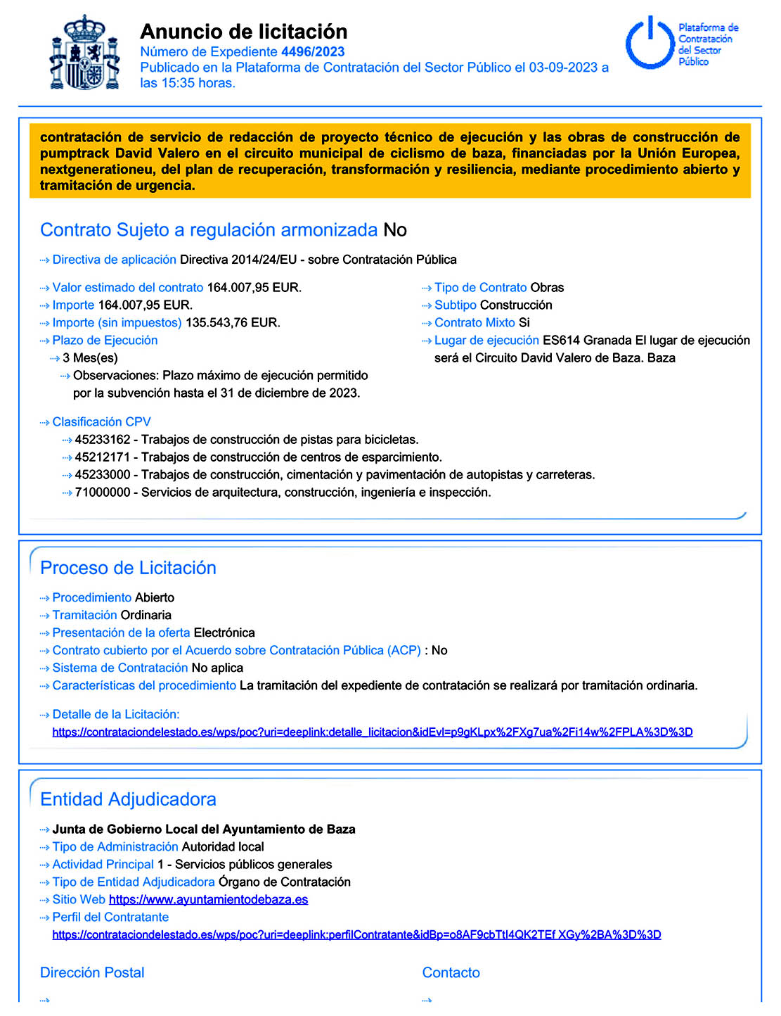 Ahora, en Baza se ha procedido a la publicación del anuncio de licitación de la contratación de servicio de redacción de proyecto técnico de ejecución y las obras de construcción del pumptrack David Valero, en el Circuito Municipal de Ciclismo de Baza, financiadas por la Unión Europea, Nextgenerationeu, del Plan de Recuperación, Transformación y Resiliencia., para loque el plazo de presentación de ofertas será hasta el próximo día 21 de este mismo mes.