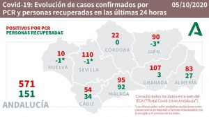 En cuanto al conjunto andaluz, la cifra de contagios totales ha alcanzado los 571 este lunes, lo que supone que el número total de positivos por coronavirus a través de PCR llegue a los 68.012. Además se han comunicado 16 muertes más y 151 curados en toda Andalucía.