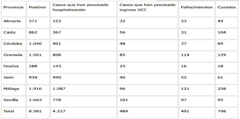 Como datos complementarios, añadamos que actualmente hay 2.349 pacientes confirmados con COVID-19 que permanecen ingresados en los hospitales andaluces, de los que 426 se encuentran en UCI.