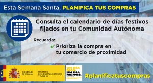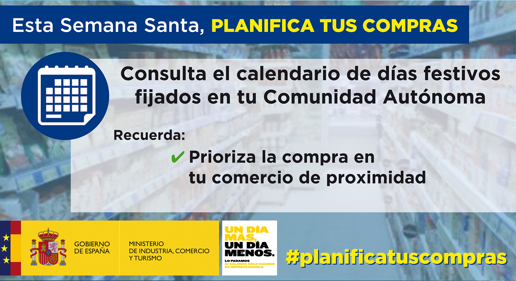 El Ministerio de Industria, Comercio y Turismo recomienda planificar las compras durante la Semana Santa. El Ministerio de Industria, Comercio y Turismo ha iniciado este lunes una campaña destinada a concienciar a la población sobre la conveniencia de planificar las compras durante la Semana Santa, a fin de reducir la movilidad y minimizar el riesgo de contagio.