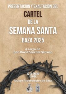 La Federación de Hermandades y Cofradías de Baza abre el año con la exaltación del Cartel Oficial de la Semana Santa 2025 y la entrega de premios de su concurso fotográfico. La Junta Permanente de la Federación de Hermandades y Cofradías de Baza ha comenzado el año extendiendo sus mejores deseos para 2025 y anunciando el primer gran acto del calendario cofrade, que se celebrará antes de la llegada de la Cuaresma. Así, el próximo 12 de enero, a las 13:00 horas, el auditorio del Museo Arqueológico de la ciudad acogerá la Presentación y Exaltación del Cartel Oficial de la Semana Santa de Baza 2025.