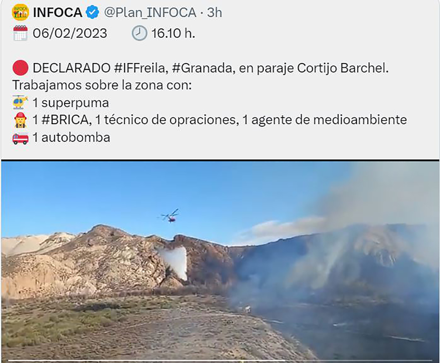 Declarado un incendio forestal a primeras horas de la tarde de ayer en Freila. Un incendio que fue dado a conocer por el propio Plan Infoca y que se había producido en el paraje del Cortijo Barchel donde el fuego había comenzado sobre las 16:10 horas de este lunes.