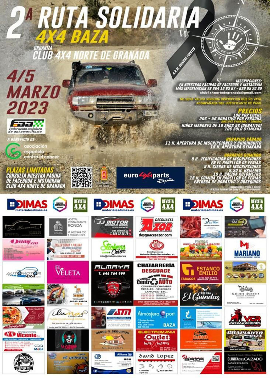 La ciudad de Baza acogerá la segunda edición de la Ruta Solidaria 4×4 2023 organizada por el Club 4×4 Norte de Granada, a beneficio de la AECC. Por segunda vez, Baza se prepara para acoger los días 4 y 5 de marzo la segunda edición de la Ruta Solidaria 4×4 Baza, una prueba no competitiva organizada por el Club 4×4 Norte de Granada, para la que han preparado pruebas de destreza con los vehículos, ruta de orientación y navegación, y diversión para toda la familia, con el objetivo de recaudar fondos para la Asociación Española Contra el Cáncer.