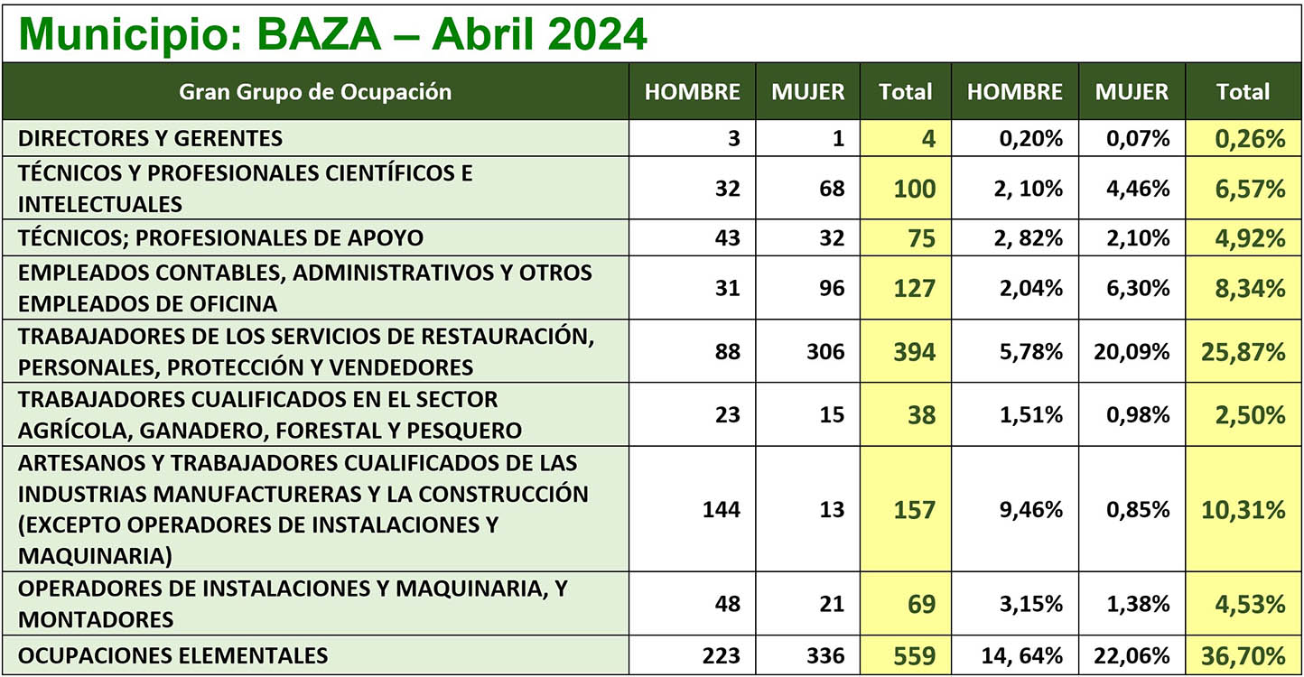 Una situación de la que su análisis detallado nos indica que, de estas 1.523 personas desempleadas en Baza, 635 son hombres y 888 son mujeres, a pesar de que ha sido una mensualidad que ha favorecido más el empleo femenino, en contra de lo ocurrido un ocasiones anteriores, de modo que, mientras que el desempleo masculino disminuía en 13 personas, la ocupación femenina mejoró con 38 mujeres que pasaban a tener empleo. Importante también dejar constancia que la nueva cifra de parados mejora en 66 personas las que han encontrado empleo que, con respecto a la tasa de desempleo interanual, que igualmente confirma una tendencia general de mejora, afectada por la mayor empleabilidad estacional y con la ilusión de que mantenga esa trayectoria en los meses sucesivos.
