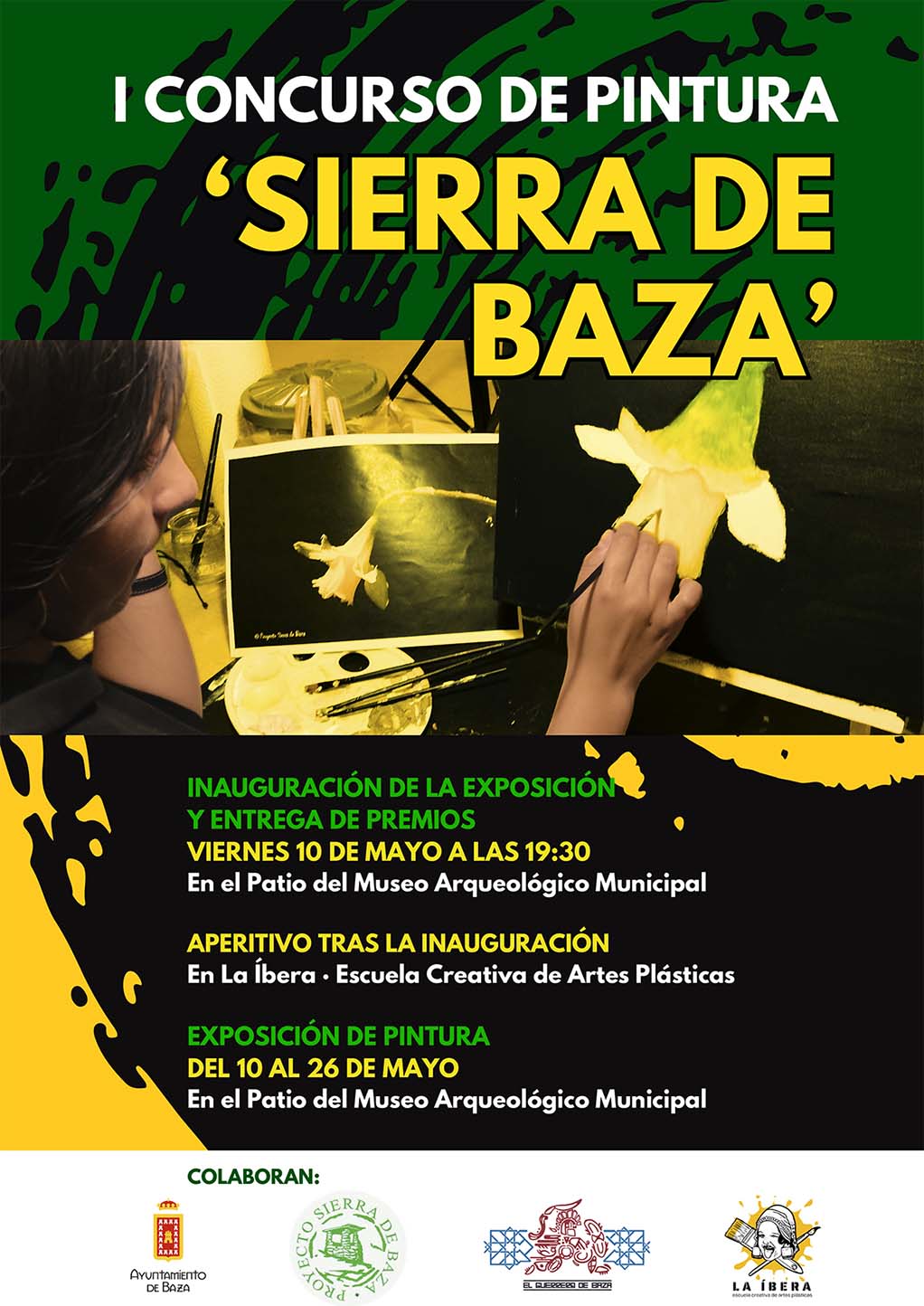 El 10 de mayo se entregan los premios del I Concurso de Pintura “Sierra de Baza” y comienza su exposición en el Museo, abierta hasta el 26 de mayo. El viernes 10 de mayo, a las 19:30 horas, se celebrará la entrega de premios del I Concurso de Pintura “Sierra de Baza”, en el que han colaborado el Ayuntamiento de Baza, la asociación Proyecto Sierra de Baza, la empresa “El Guerrero de Baza” y La íbera · Escuela Creativa de Artes Plásticas. Será en el patio del Museo Arqueológico Municipal, en el que en ese mismo momento se inaugurará una exposición con los trabajos presentados, que estará abierta hasta el 26 de mayo.