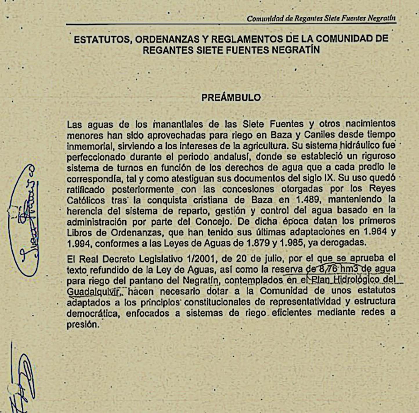 Preámbulo de los estatutos de la Comunidad aprobados por la CHG.. Clicar en la imagen para agrandarla