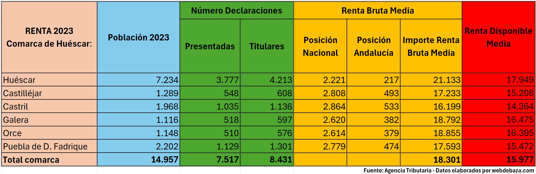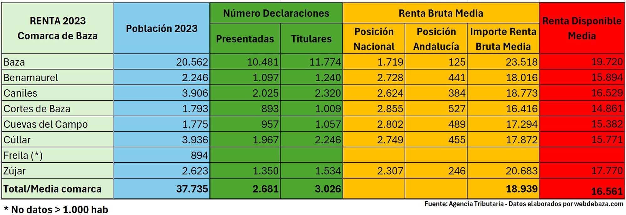En resumen, los datos de 2023 confirman que Baza actúa como polo vertebrador de la comarca, con una renta bruta media que lo sitúa por encima de muchos municipios menores del entorno, pero también ilustran la persistente brecha territorial entre la cabecera y los pueblos de la comarca. La estadística de la Agencia Tributaria —disponible en su portal y en el catálogo de datos abiertos— ofrece el detalle municipio a municipio que permitiría, si se utiliza con voluntad política, orientar inversiones y diseñar medidas que frenen la pérdida de dinamismo demográfico y económico en los municipios más vulnerables.