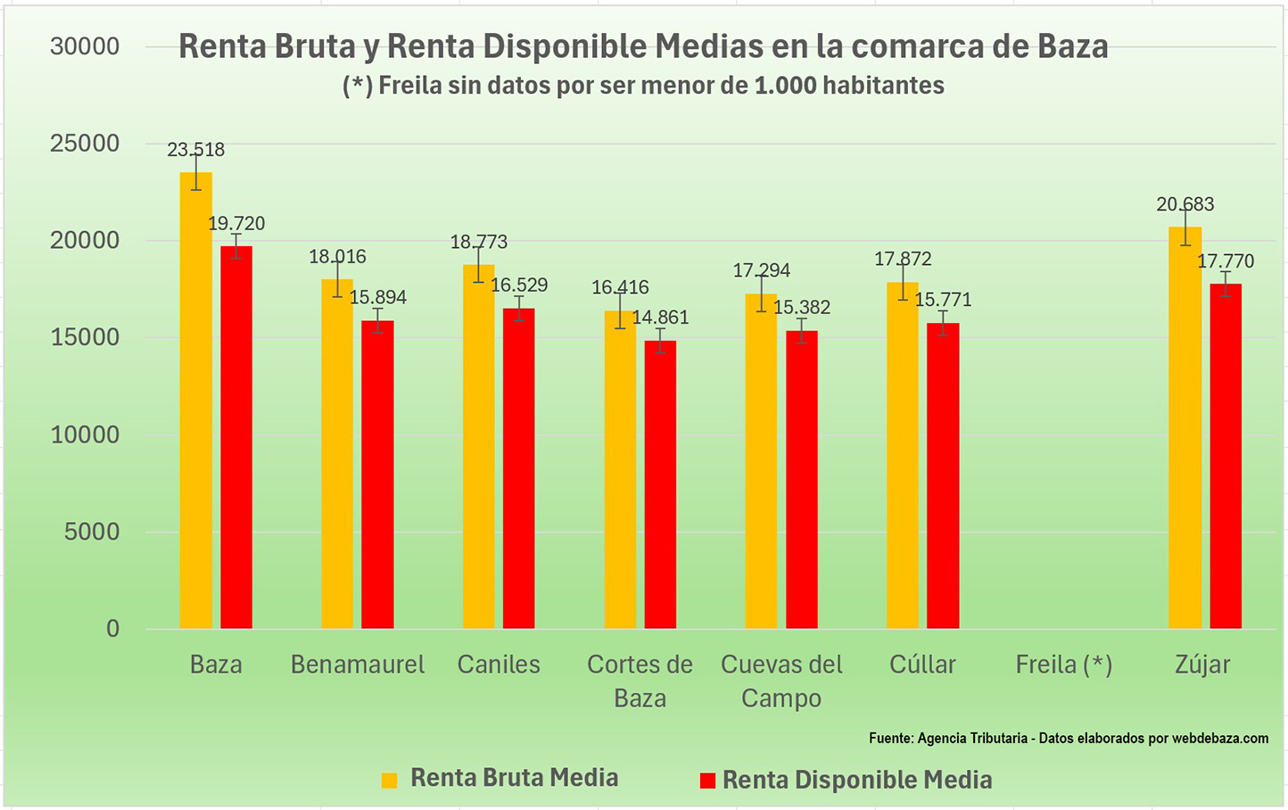 Estos datos reflejan la realidad económica de Baza: una ciudad de tamaño medio en el norte de la provincia de Granada, con un peso fuerte de los ingresos procedentes del trabajo y de las actividades económicas, aunque con rentas medias que la sitúan lejos de los municipios más prósperos tanto de la comunidad autónoma como del conjunto de España.