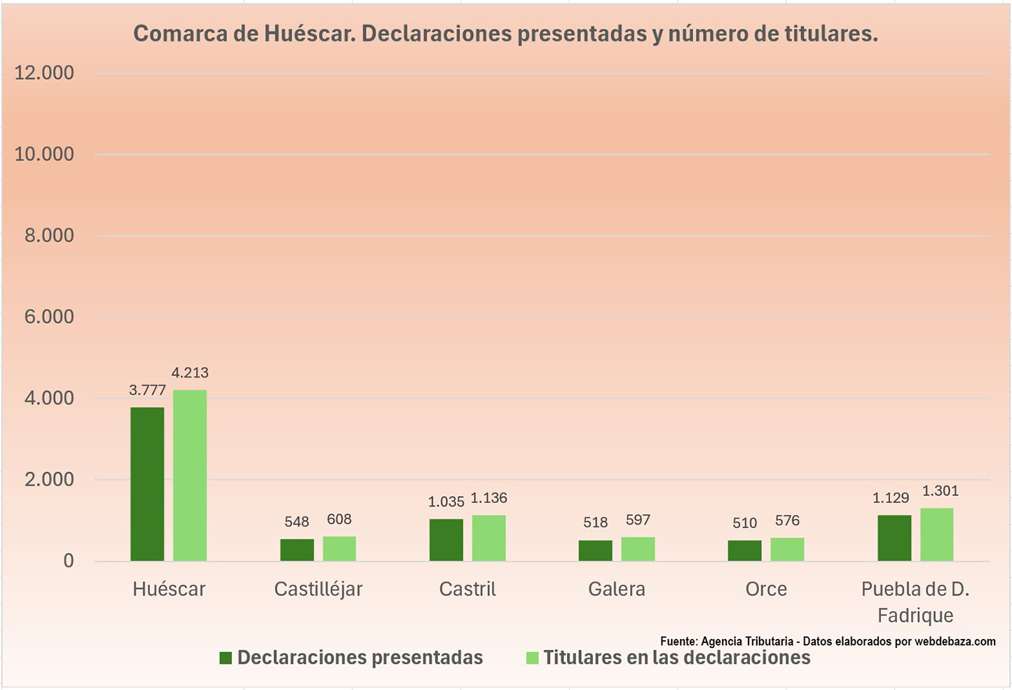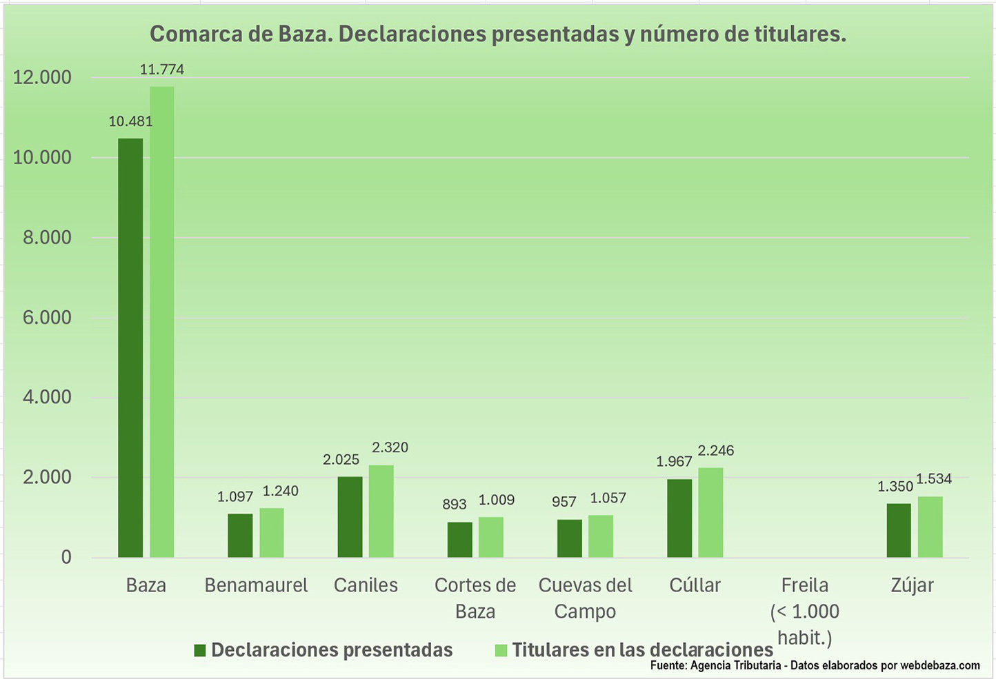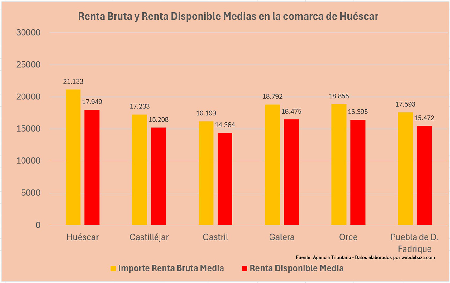 Estas dos comarcas las forman los catorce municipios de Baza y Huéscar —Baza, Benamaurel, Caniles, Cortes de Baza, Cuevas del Campo, Cúllar, Freila, Zújar, Castilléjar, Castril, Galera, Huéscar, Orce y Puebla de Don Fadrique— muestra, según la estadística, una distribución de rentas que penaliza a los municipios menores y premia a las cabeceras intermedias. En Baza se concentran casi todas las magnitudes: número de declaraciones, masa salarial y volumen de actividad económica recogidos por la Agencia Tributaria para 2023; en los pueblos próximos, por contra, abundan niveles de renta bruta media notablemente más bajos y estructuras demográficas envejecidas.