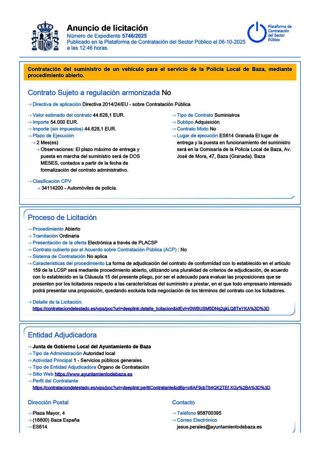 El Ayuntamiento de Baza inicia el proceso para adquirir un nuevo vehículo destinado a la Policía Local. El Ayuntamiento de Baza ha iniciado el procedimiento para la adquisición de un nuevo vehículo destinado al servicio de la Policía Local, con el objetivo de reforzar los medios materiales del cuerpo y garantizar un funcionamiento óptimo de las labores de seguridad y vigilancia en el municipio.