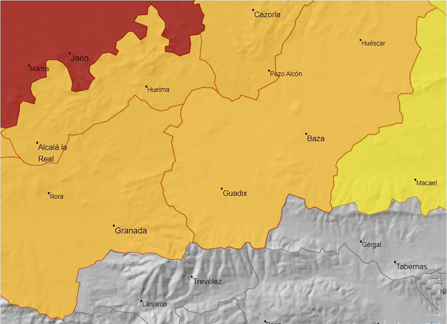 En el caso de Baza, donde ayer la mínima y la máxima fueron, respectivamente, de 16,7 grados a las 7,10 h, y 35,3 grados a las 16,30 h., la Agencia Estatal de Meteorología ha decretado sendas alertas naranja de las que hoy estará vigente la primera de ellas, con riesgo importante de temperaturas máximas estimado en 40ºC, que afectará a casi toda la provincia granadina, con la excepción de la zona costera, en la franja horaria que va desde la una del mediodía a las nueve de la noche. En ese mismo sentido la segunda de las alertas es la del miércoles próximo, esta vez con temperaturas máximas de 42ºC, en la misma zona geográfica y con horario de riesgo destacado entre las doce del mediodía y las nueve de la noche.