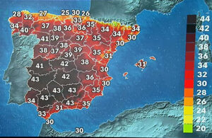 El miércoles aún subirán más las temperaturas, sobre todo en el área cantábrica y mitad oriental peninsular, aunque es probable que se inicie un descenso de temperaturas en el extremo occidental. Este día será probablemente el día álgido de este episodio y se podrían alcanzar o superar los 42-44ºC en amplias áreas de la mitad sur y zona centro, y los 40ºC en zonas del Cantábrico oriental, centro de la meseta norte y valle del Ebro.