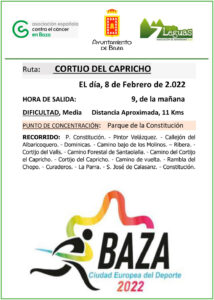 La AECC inicia este martes la edición de 2022 de su programa “En marcha” con una ruta al Cortijo del Capricho. La sede la Asociación Española Contra el Cáncer (AECC) inicia este martes la edición de 2022 de su programa “En marcha”, con el que se apuesta por la adquisición de hábitos saludables a través de la práctica de actividad física moderada como una de las mejores formas de fomentar una vida activa y saludable, así como de prevenir determinadas enfermedades como el cáncer. Este programa consiste en una serie de Rutas Saludables que cuentan con el apoyo del Ayuntamiento de Baza y del Grupo de Senderismo 7 Leguas. Las salidas se realizan los martes desde el Parque de la Constitución y la de este martes se dedicará a ir al Cortijo del Capricho.