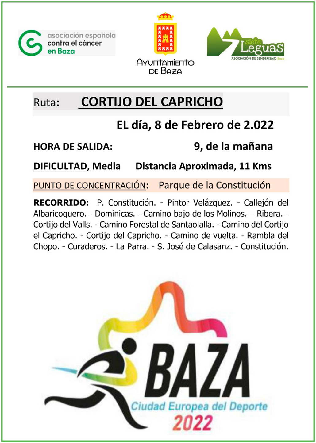 La AECC inicia este martes la edición de 2022 de su programa “En marcha” con una ruta al Cortijo del Capricho. La sede la Asociación Española Contra el Cáncer (AECC) inicia este martes la edición de 2022 de su programa “En marcha”, con el que se apuesta por la adquisición de hábitos saludables a través de la práctica de actividad física moderada como una de las mejores formas de fomentar una vida activa y saludable, así como de prevenir determinadas enfermedades como el cáncer. Este programa consiste en una serie de Rutas Saludables que cuentan con el apoyo del Ayuntamiento de Baza y del Grupo de Senderismo 7 Leguas. Las salidas se realizan los martes desde el Parque de la Constitución y la de este martes se dedicará a ir al Cortijo del Capricho.