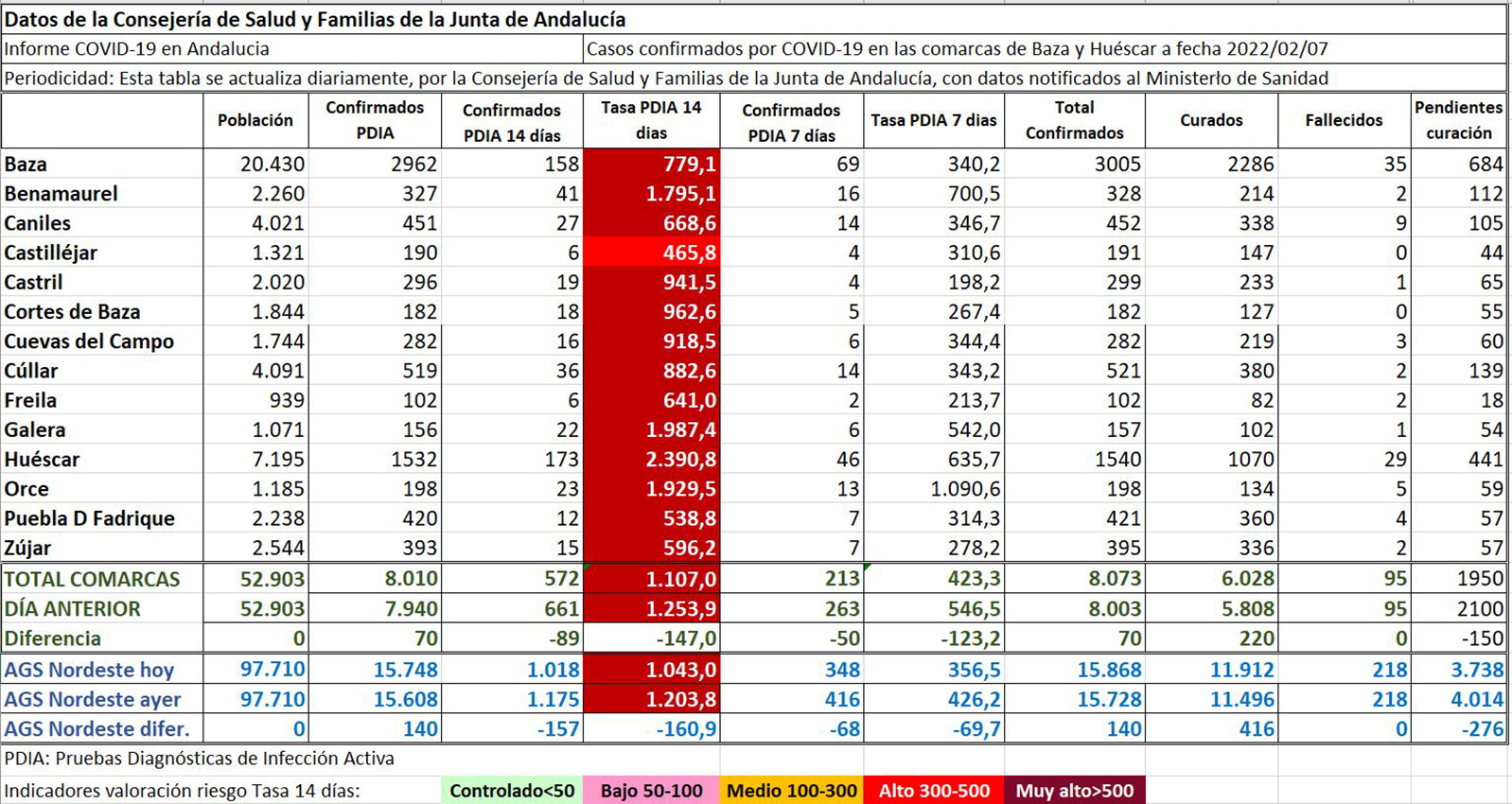 En cuanto a las comarcas de Baza y Huéscar, se registraron la mitad de contagios nuevos, 70, y con 89 confirmados menos a 14 días, la tasa bajaba hasta los 1.107 casos por 100.000 habitantes, mientras que a 7 días la tasa es de 423,3, valores ambos que superan la media del AGS Nordeste y, en mayor medida, la media provincial. Sí que resultó más positiva la cifra de curados, con 220 que bajaban la cifra global hasta 1.950, tras restar otros 150 más.