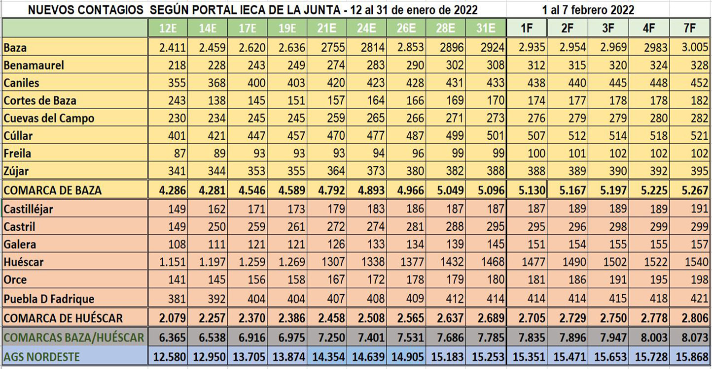 Ya son diez los municipios de las comarcas de Baza y Huéscar que bajan de mil su tasa de incidencia a 14 días, el día en que Baza supera los 3.000 contagios durante la pandemia. Baza, Caniles, Castilléjar, Castril, Cortes de Baza, Cuevas del Campo, Cúllar, Freila, Puebla de don Fadrique y Zújar son los diez municipios de estas dos comarcas que ya han bajado de la tasa de incidencia mil, con una tendencia que augura que seguirán en descenso, mientras que Benamaurel, Galera y Orce están entre 1.795 y 1.9987 y solo Huéscar se va hasta la tasa 2.390,8, tras una bajada casi generalizada al terminar el último fin de semana, que ha supuesto bajadas notables en las tasas de las dos comarcas norteñas y del conjunto del AGS Nordeste de Granada.