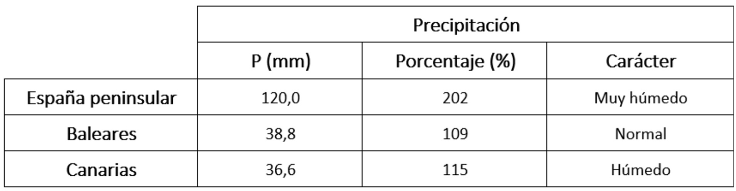 En los observatorios principales, las mayores precipitaciones diarias registradas correspondieron al paso de la borrasca Nelson y se dieron en Ceuta, que registró 72,0 mm el día 9; Morón de la Frontera con 68,7 mm el día 30 que constituye el valor más alto de su serie desde 1949; Jerez de la Frontera con 61,0 mm el día 8, que también constituye el valor más alto de su serie desde 1946; Jaén con 54,0 mm el día 30 y Hondarribia/Malkarroa con 53,6 mm el día 2. En cuanto a la precipitación total del mes, en las estaciones principales destacan los 287 mm de Ceuta, los 255,4 mm acumulados en Santiago de Compostela/aeropuerto, los 242,8 mm de Jaén y los 226,4 mm de Puerto de Navacerrada.