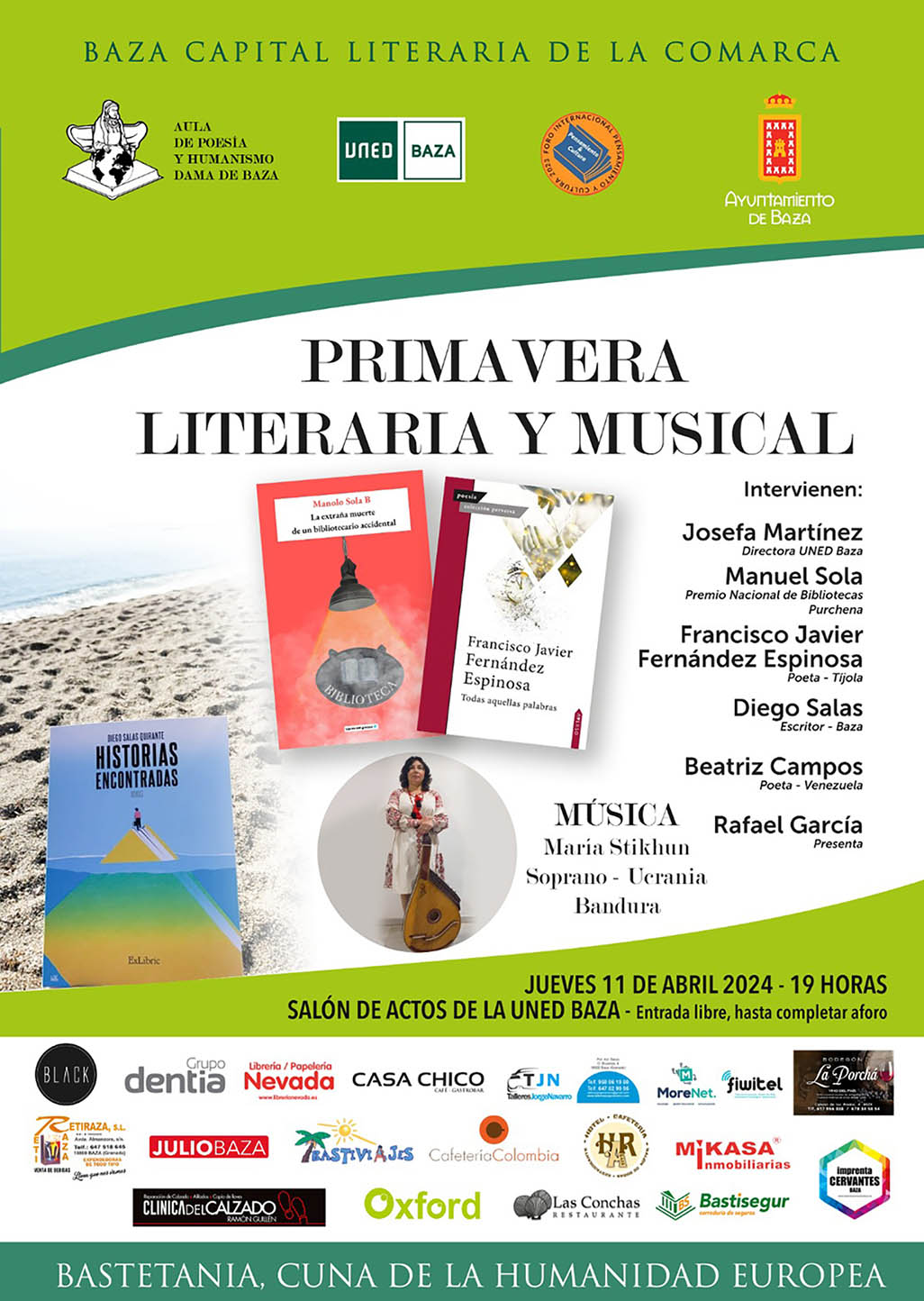 “Primavera Literaria y Musical”, nueva propuesta del Aula de poesía y humanismo para este jueves 11 de abril, a las siete de la tarde en la UNED. El Aula de Poesía y Humanismo “Dama de Baza” nos lanza una nueva propuesta cultural para este jueves, 11 de abril. Se trata de la Primavera Literaria y Musical, una agradable tarde dedicada a escuchar buena literatura y buena música en buena compañía, en el salón de actos de la UNED de Baza, con entrada libre hasta completar aforo. El comienzo está previsto para las 19:00 horas.