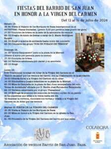Del 13 al 16 de julio llegan las fiestas del barrio de San Juan, en honor a la Virgen del Carmen, cuyo altar se montará el día 15 y saldrá en procesión por las calles del barrio el martes 16. El barrio de San Juan toma el relevo festivo en este caluroso mes de julio bastetano, con la llegada de las fiestas en honor a su patrona, la Virgen del Carmen, cuya imagen ocupa lugar preferente en la parroquia de este barrio y tiene una Hermandad de fieles.