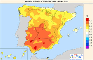 Las temperaturas máximas diarias en abril se situaron en promedio 4,7°C por encima del valor normal. Por su parte, las mínimas se situaron 1,3°C por encima de la media, resultando una oscilación térmica diaria 3,4°C superior a la normal del mes. En treinta estaciones principales, la temperatura media del mes fue la más alta de un mes de abril desde que existen registros. En cuarenta y cinco estaciones principales la media de las temperaturas máximas fue la más alta de la serie de abril, y en cuatro la media de las mínimas fue también la más alta de abril desde el comienzo de las observaciones.