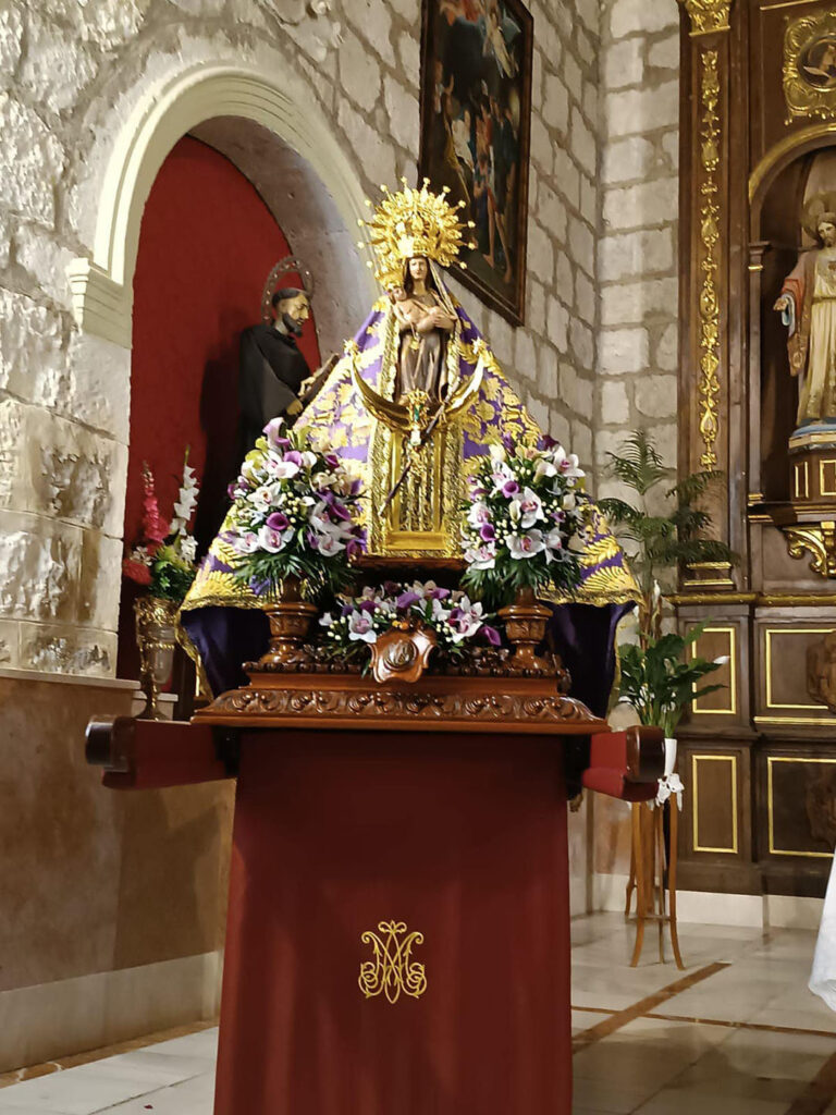 Como de costumbre, la Virgen de la Piedad iba en procesión, sobre sus andas a hombros de miembros de su Cuerpo de Horquilleros y acompañaba por los sacerdotes de ambas iglesias, hermanos y fieles, siendo recibida en su templo con cantos, aplausos y un sonoro volteo de campanas, tras lo que se organizó la procesión claustral que la llevó a su camarín, donde luce su manto azul que portará durante el mes de mayo, mes de celebración del Oficio de las Flores, tras el rezo del Santo Rosario y la celebración de la Eucaristía, que se inicia a las ocho de la tarde. Finalizados los cultos, la Virgen de la Piedad podrá ser visitada en su camarín.