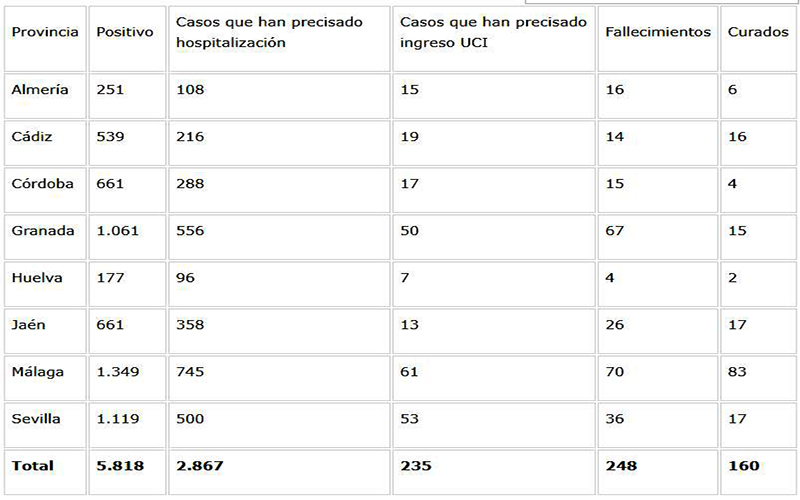 La Consejería Salud y Familias informa que se han confirmado en Andalucía 413 nuevos casos de Coronavirus en las últimas horas. La Consejería Salud y Familias informa que se han confirmado en Andalucía 413 nuevos casos de Coronavirus en las últimas horas, por lo que el número total de afectados en Andalucía asciende a 5.818. Los datos acumulados son los que ofrecemos en el dato adjunto, el cual se puede ampliar con solo clicar encima suyo: