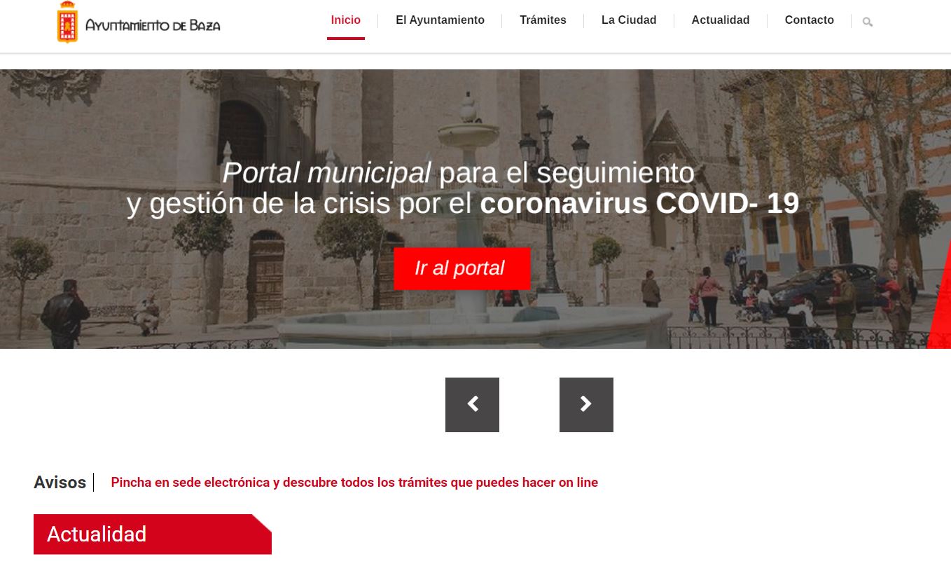 El Ayuntamiento estrena un portal con información específica del coronavirus. El Ayuntamiento de Baza ha puesto a disposición de la ciudadanía un nuevo recurso informativo relacionado con el coronavirus que recopila todos los recursos, avisos a la población y noticias de la pandemia a nivel local y nacional. Se trata de un portal web que nace de la colaboración municipal con la Asociación de Técnicos de Protección Civil de Andalucía y al que se puede acceder a través de la página web municipal ayuntamientodebaza.es.