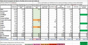 Del resto de localidades, solo se produjeron cambios en las dos comarcas comarcales; en Baza, con dos confirmados menos a 14 días y bajando la tasa de incidencia a 29,4, mientras que a 7 días tenía otros dos casos menos y una tasa de 9,8 casos por 100.000 habitantes. El otro caso fue el de la otra capital comarcal, donde los confirmados PDIA a 14 días se reajustaban con otros cuatro más que el día anterior y una tasa a 14 días de 166,8 casos por 100.000 habitantes, cifras que repetía esta localidad a 7 días.