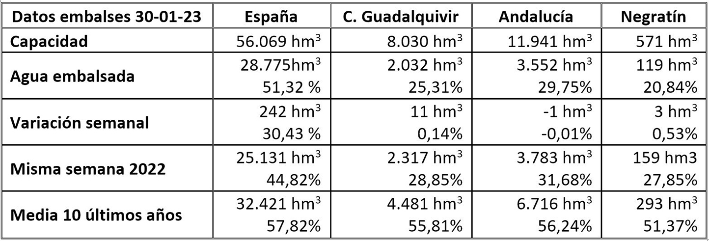 La semana ha tenido un mínimo crecimiento del agua embalsada, acorde con la situación geográfica de los embalses y la falta de precipitaciones en nuestra zona. Como viene ocurriendo cada semana, ayer martes 31 de enero se daba a conocer la habitual información sobre el estado de los embalses españoles, con datos del día 30 de enero, que arrojan unas cifras algo mejores que la semana anterior, aunque con pocas diferencias. Así, la reserva hídrica de toda España es de 28.775 hectómetros cúbicos, que supone estar al 51,32% de su capacidad, mientras que el Negratín ha vuelto a crecer otros 3 hectómetros, a pesar de haber sido una semana sin precipitaciones, acercándose un poco más al 21% de su capacidad y almacenando 119 hm3., tras aumentar 3 hm3 esta última semana.