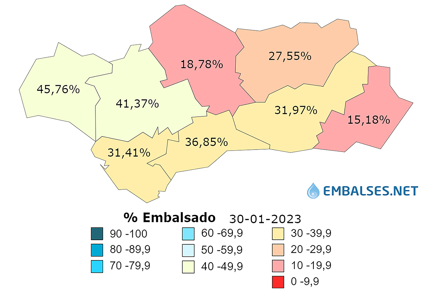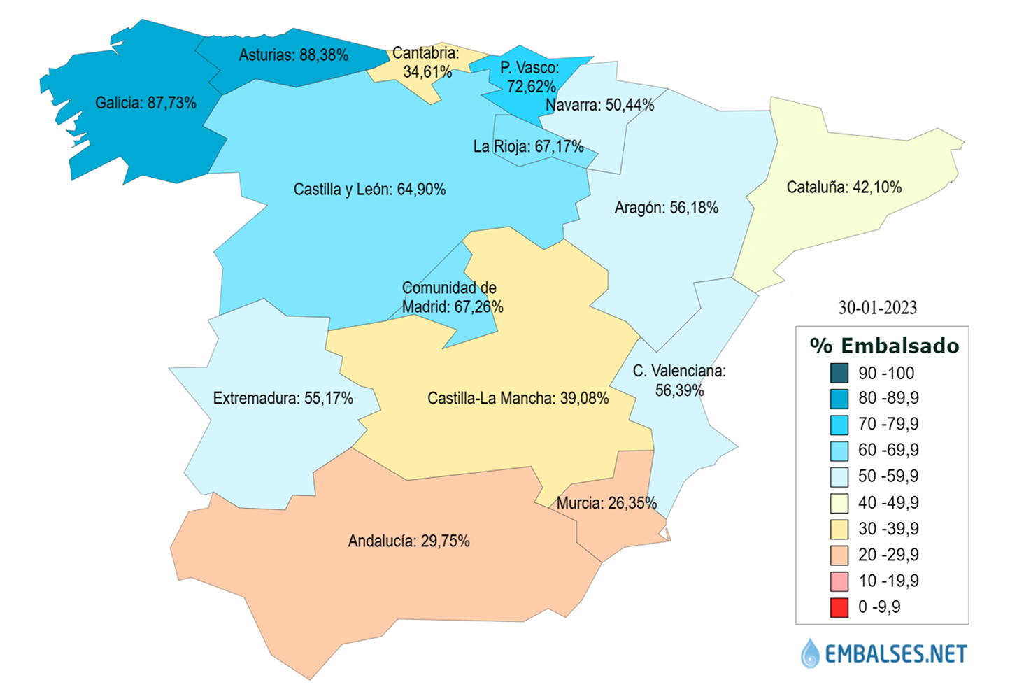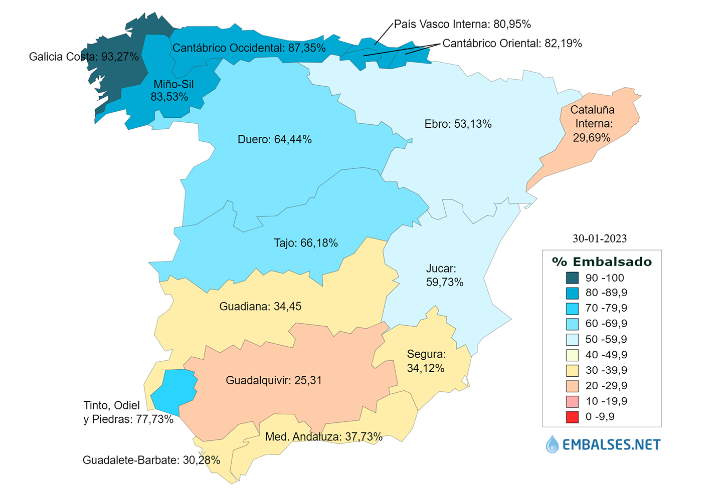 En cuanto a la reserva por ámbitos, la situación de mayor a menor cantidad de agua almacenada en las diferentes cuencas, es la siguiente: Galicia Costa se encuentra al 93,3%, Cantábrico Occidental al 87,3%, Miño-Sil al 83,5%, Cantábrico Oriental al 82,2%, Cuencas internas del País Vasco al 81%, Tinto, Odiel y Piedras al 77,7%, Tajo al 66,2%, Duero al 64,4%, Júcar al 59,7%, Ebro al 53,1%, Cuenca Mediterránea Andaluza al 37,7%, Guadiana al 34,4%, Segura al 34,1%, Guadalete-Barbate al 30,3%, Cuencas internas de Cataluña al 29,7% y Guadalquivir al 25,3%.