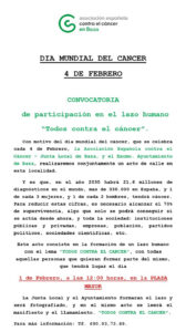 AECC y Ayuntamiento invitan a participar en la realización de un lazo humano contra el cáncer este miércoles 1 de febrero a las 12h en la Plaza Mayor. Con motivo del Día Mundial Contra el Cáncer que se conmemora anualmente cada 4 de febrero, la Junta Local de la Asociación Española Contra el Cáncer de Baza y el Ayuntamiento bastetano han programado un acto conjunto, que se celebra en la mañana de hoy, miércoles 1 de febrero, unos días antes de la fecha oficial, a partir de las 12h en la Plaza Mayor.