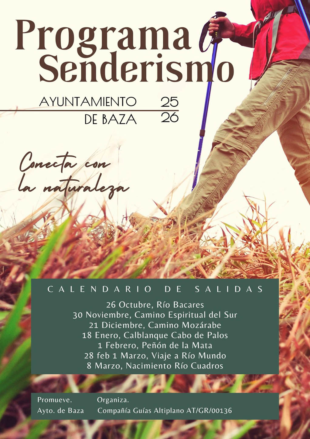 Vuelve el Programa Municipal de Senderismo en su edición 2025-2026 con una serie de interesantes propuestas que ya tienen abierto el plazo de inscripción. El Programa Municipal de Senderismo regresa un año más a Baza con una propuesta de siete rutas que permitirán disfrutar de la naturaleza, el deporte y la convivencia en grupo. La iniciativa, impulsada por la concejalía de Deportes del Ayuntamiento de Baza, contará de nuevo con la organización de la Compañía Guías Altiplano (AT/GR/00136), dirigida por el bastetano Manuel Mateos, quien estará al frente de la planificación y coordinación de las salidas.